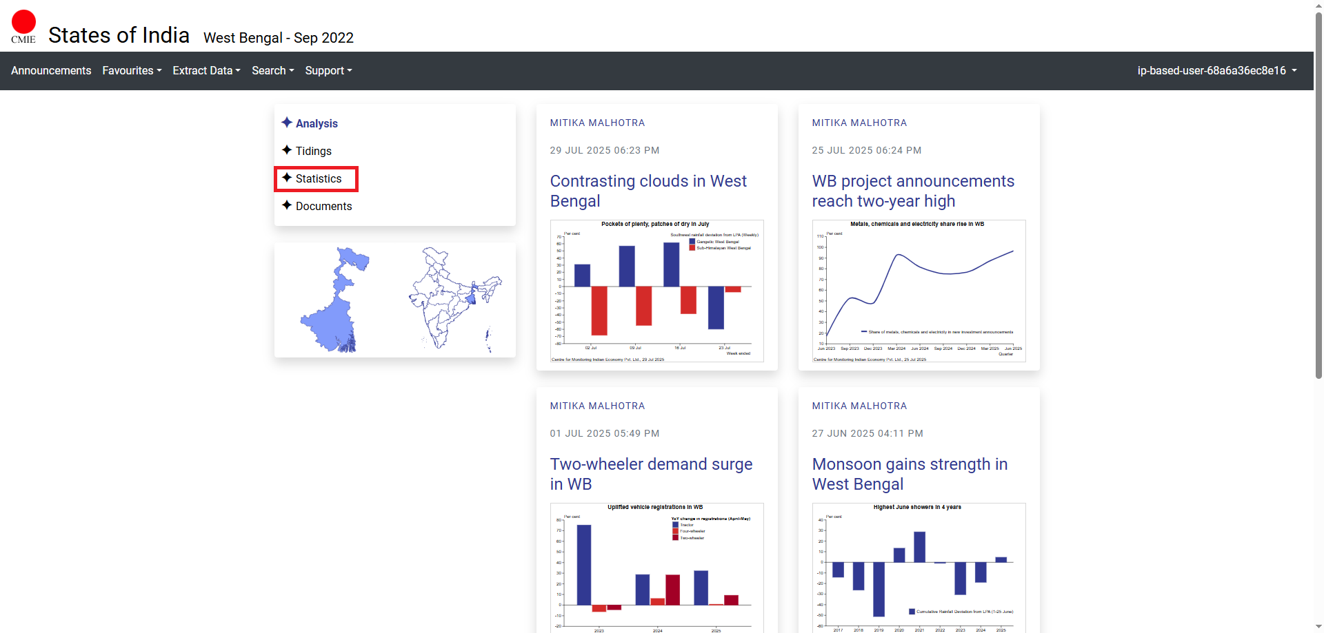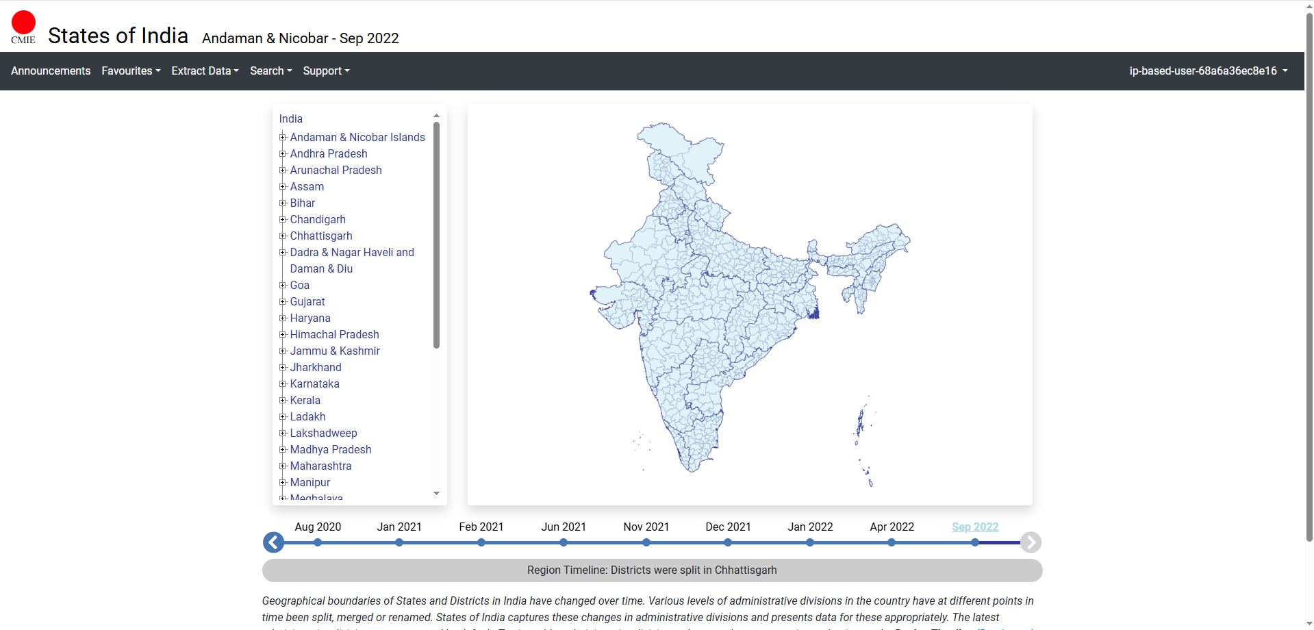 States of India is a large statistical compendium of the 37 states, union territories 724 districts of India. Statistics on states are released by various state & central agencies. CMIE excels in compiling all this information into one cohesive and seamless offering.States of India focuses on providing up-to-date data and up-to-date news on the individual regions. There are over 85 million time series in this service. All information is available in a clean and easily usable form so that when you need it, you find it without much ado.The statistics covered here include a wide spectrum of economic and socio-economic indicators. This is a veritable Goldmine for an analyst. It is a convenient source to look up for quick facts as much as to conduct inter-state comparisons.