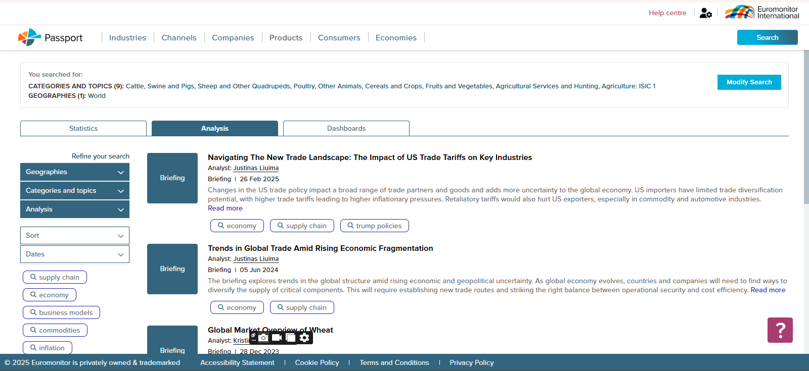 Euromonitor Passport is a global market research database providing insight on industries, economies and consumers worldwide, helping clients analyse market context and identify future trends impacting businesses globally. It offers in-depth information and analysis on industries and consumers for 1200 cities and 210 countries.