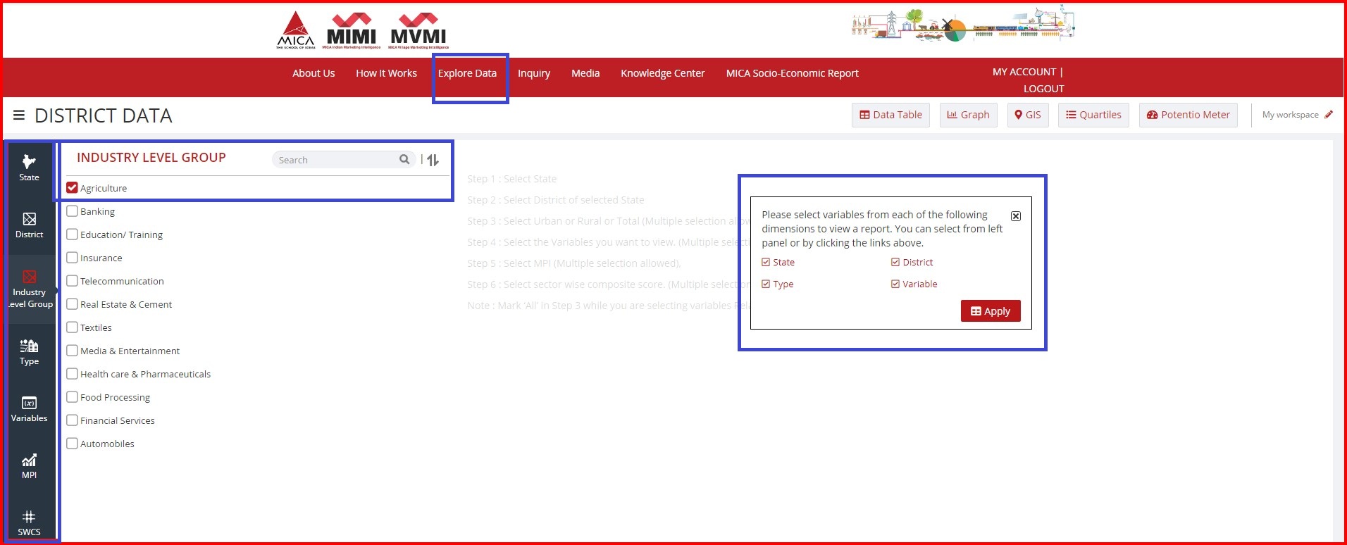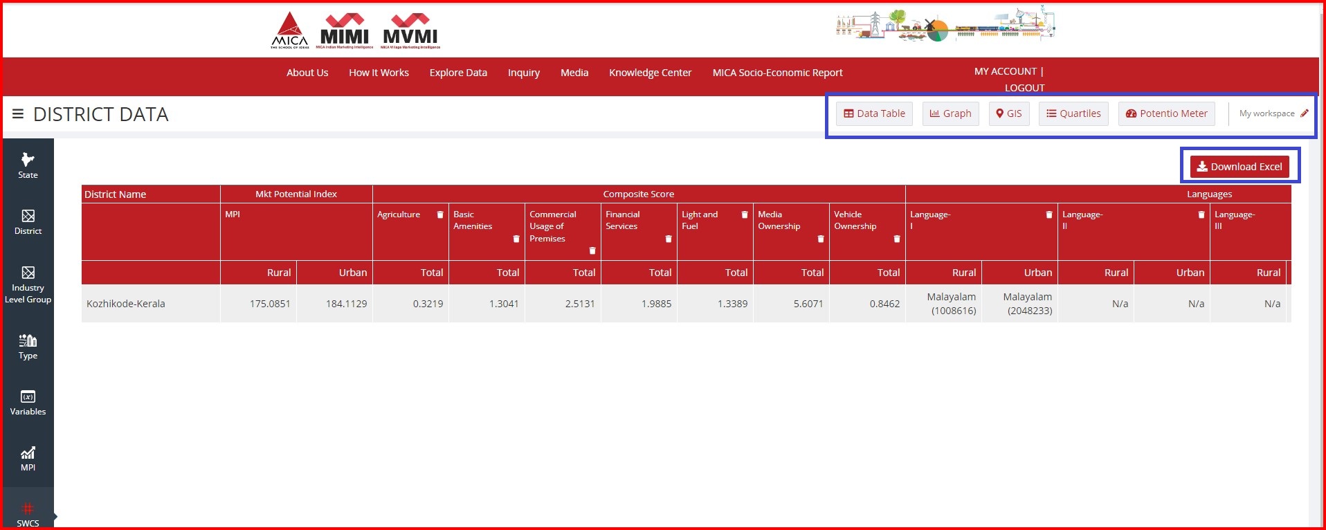 MVMI:- MICA Village Marketing Intelligence (MVMI) is first in its type, and it provides the secondary data for socio-economic variables and market intelligence up to the Village level for all the States and Union Territories of India. The summary of such information is provided up to District level and Sub-District level. In addition to that Rural MPI (Market Potential Index) for 630 Districts is also provided.