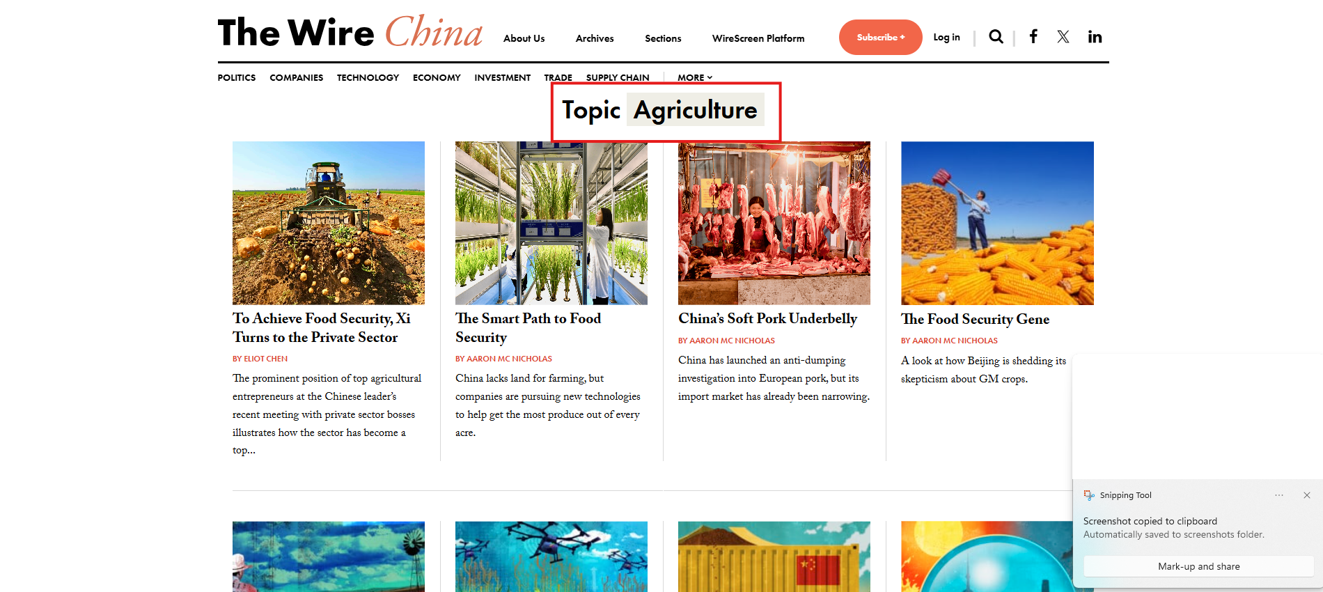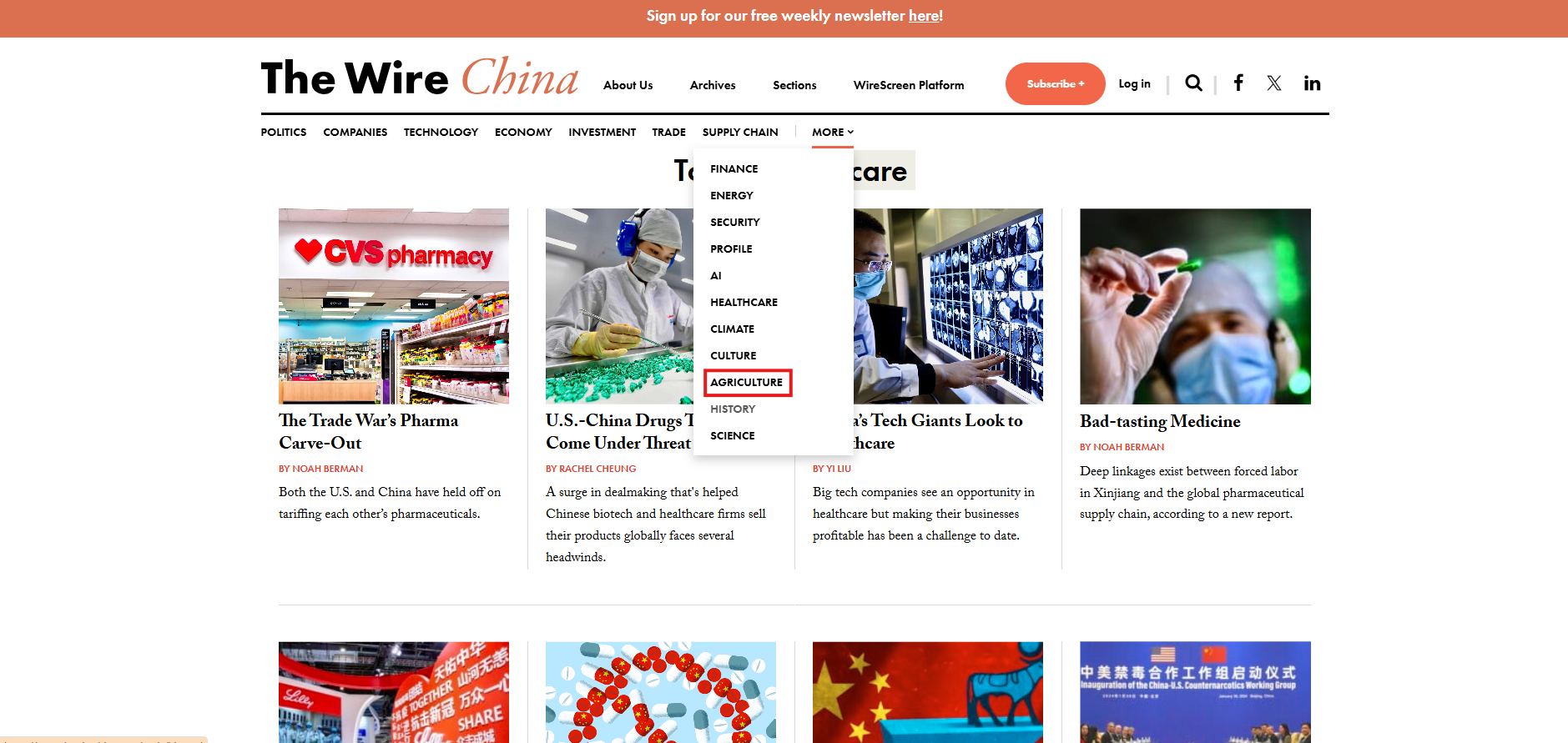 The Wire China is a weekly online news magazine focused on Chinese business, economics and finance. It publishes five to six articles per week including a 3,000-5,000 word cover story, a news and analysis piece, a data investigation called 'The Big Picture', Q&A, and an Opinion section.