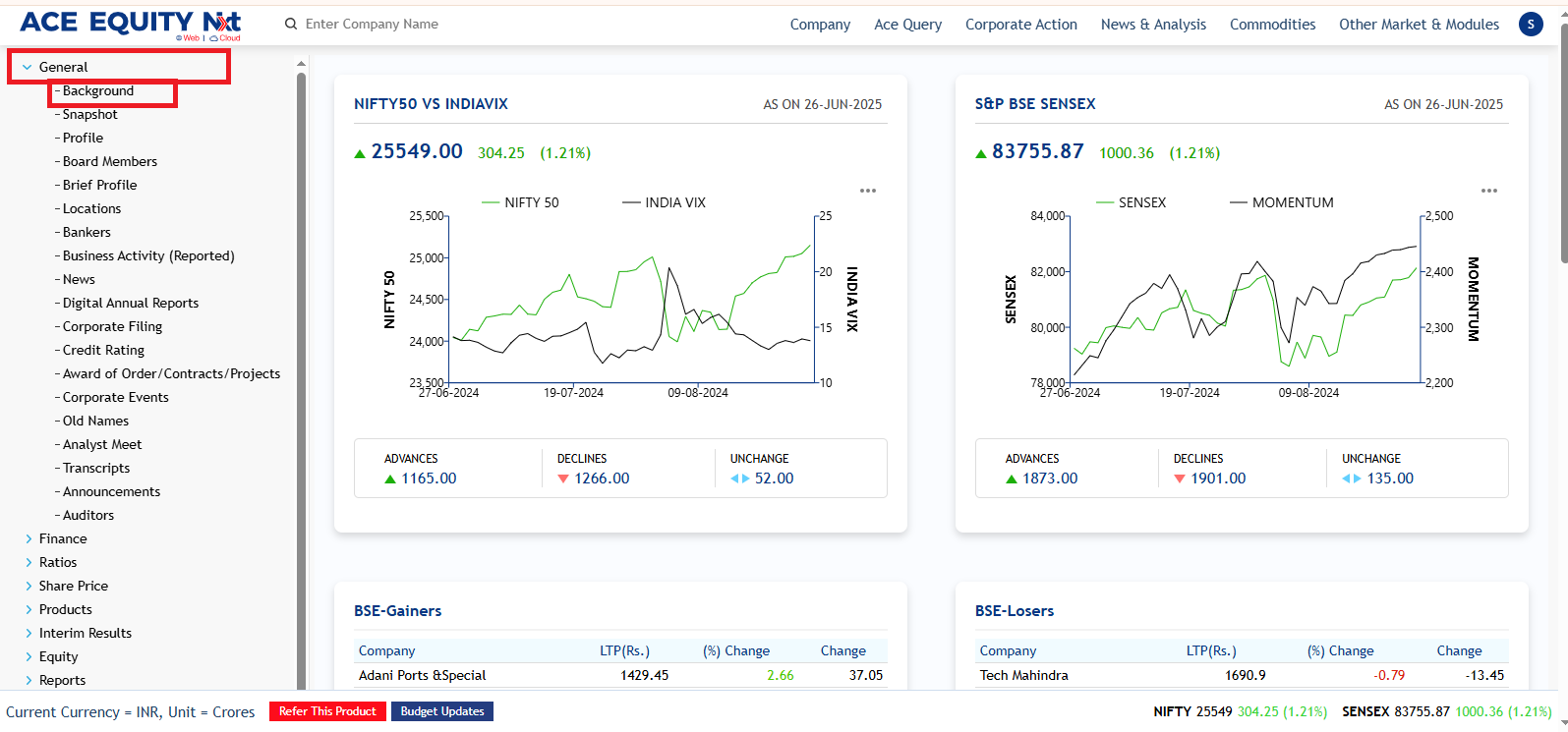 ACE EQUITY Nxt..is a Windows based application where the product data is hosted in cloud. Product provides comprehensive financial data of listed and private companies. The company financial information is available for more than 40,000 Indian companies, including 7,000 listed and 33,000 private with 1750 unique financial data fields compiled from the Annual Report. It also provides company’s non-financial information such as board of directors, share holding pattern, Corporate actions etc. The application is designed in such a manner that with minimal clicks user can achieve the desired output
