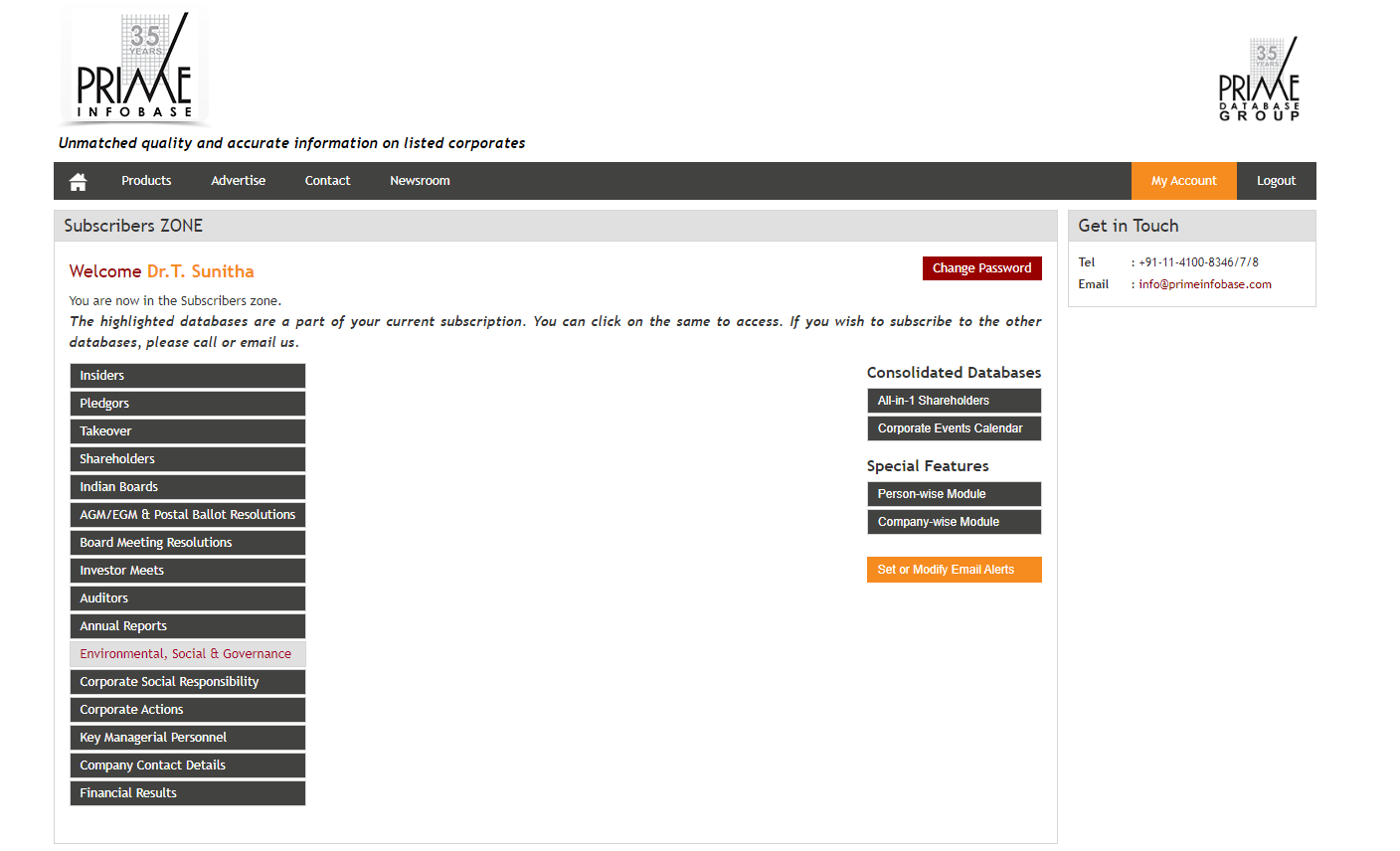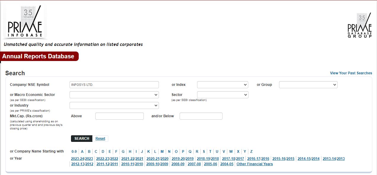 PRIME Database Group is India's leading data provider on the capital market. The library can access Prime Database, Prime Infobase, and Prime Mutual Funds Database.Prime Infobase Database (http://www.primeinfobase.com/) Prime Infobase provides timely (daily updated), complete (all companies listed on NSE and companies exclusively listed on BSE with a market capitalization of more than INR 1000 crore), credible and clean data and analytics on corporates in an extremely easy-to-use and searchable manner.Prime Mutual Funds Database (http://www.primemfdatabase.com/) Prime Mutual Funds database provides timely, complete, credible, and clean data and analytics on mutual funds, covering their monthly holdings/portfolios, assets under management, trading in debt & money market securities, scheme performance and voting details among others, in an extremely easy-to-use and searchable manner (subscription covers Module A, B, E, F & G).