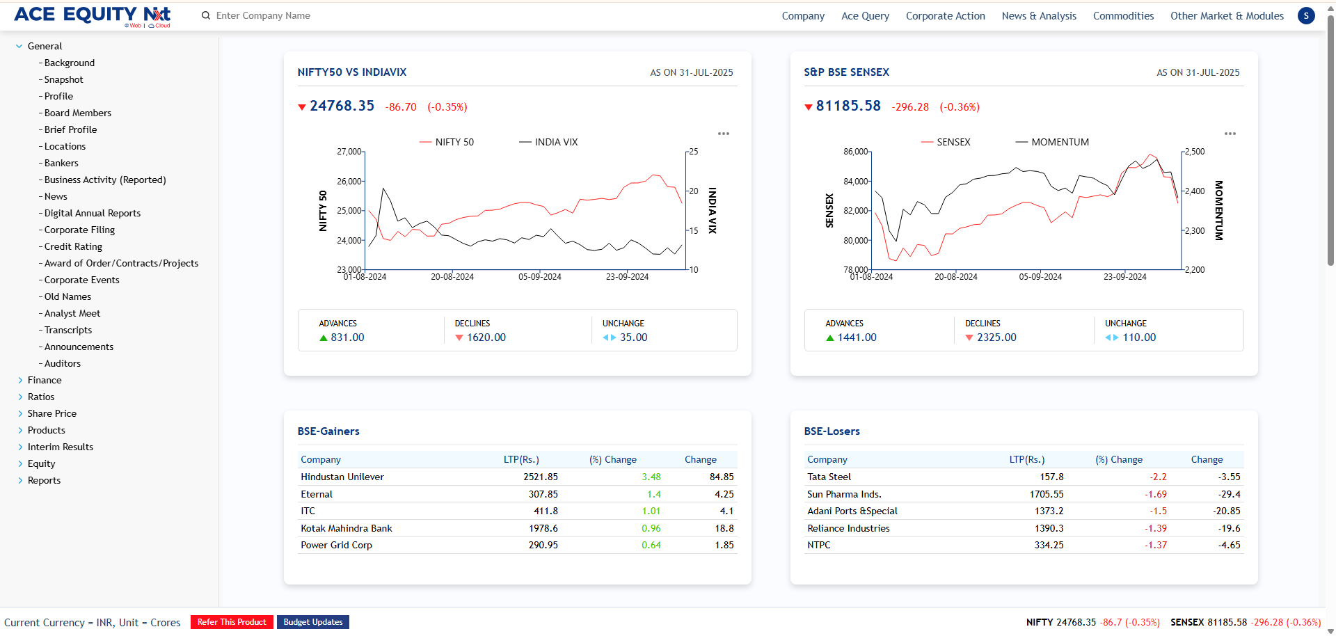 ACE EQUITY Nxt..is a Windows based application where the product data is hosted in cloud. Product provides comprehensive financial data of listed and private companies. The company financial information is available for more than 40,000 Indian companies, including 7,000 listed and 33,000 private with 1750 unique financial data fields compiled from the Annual Report. It also provides company’s non-financial information such as board of directors, share holding pattern, Corporate actions etc. The application is designed in such a manner that with minimal clicks user can achieve the desired output