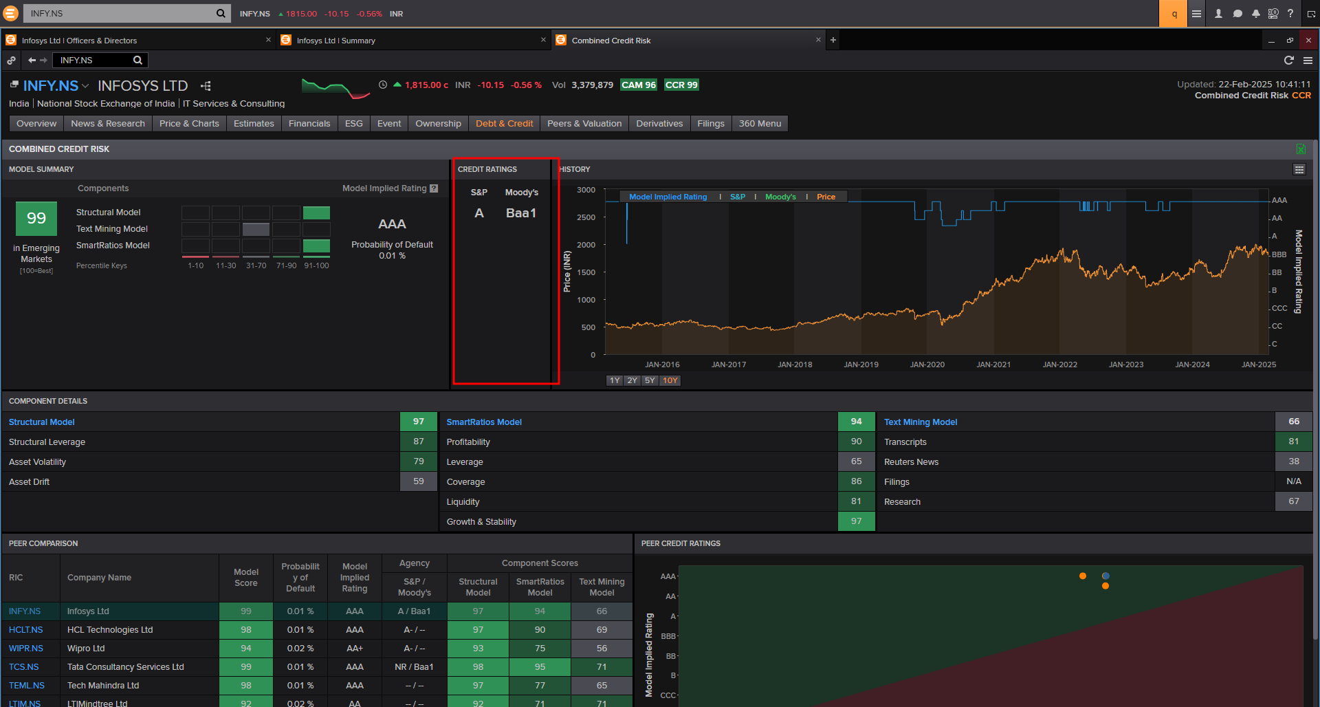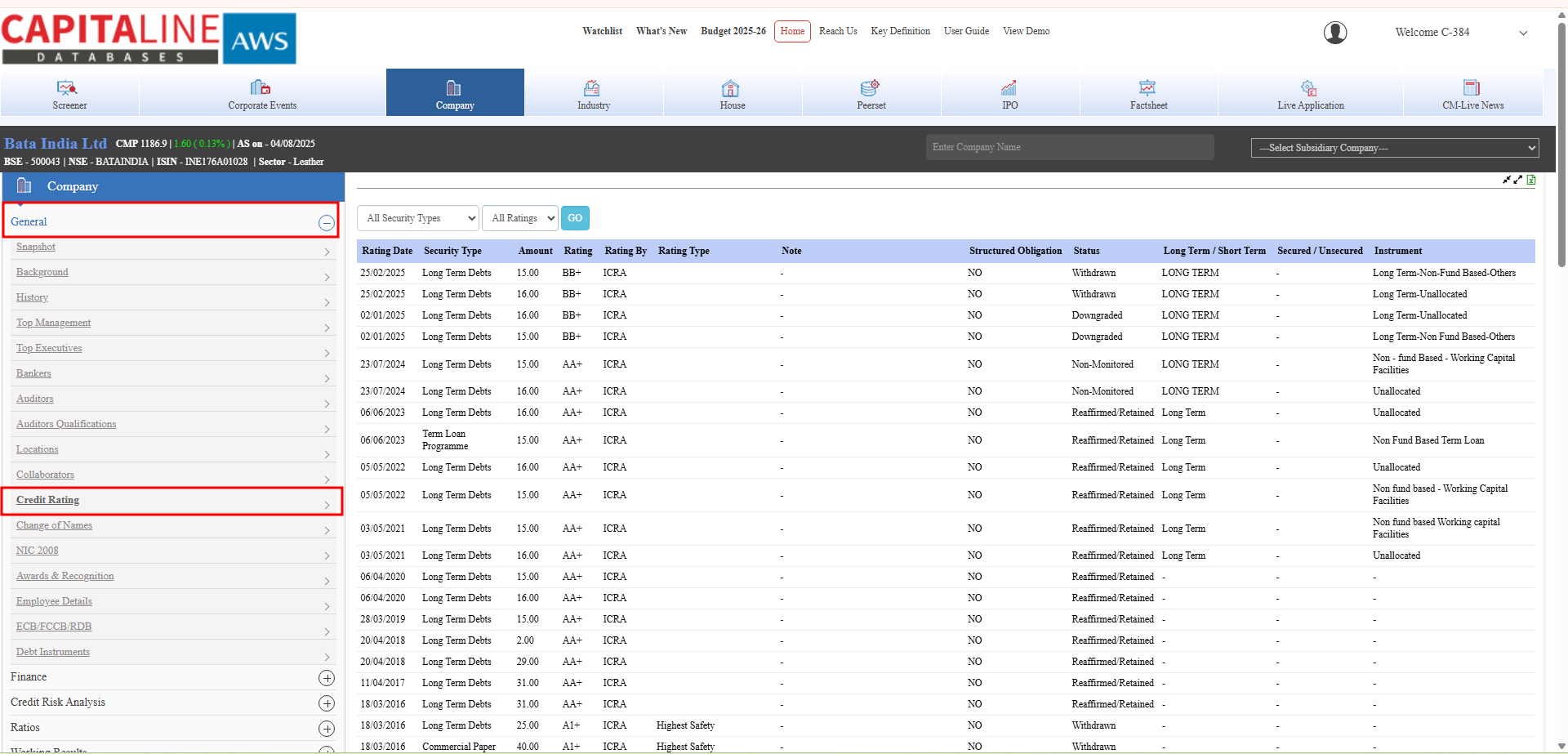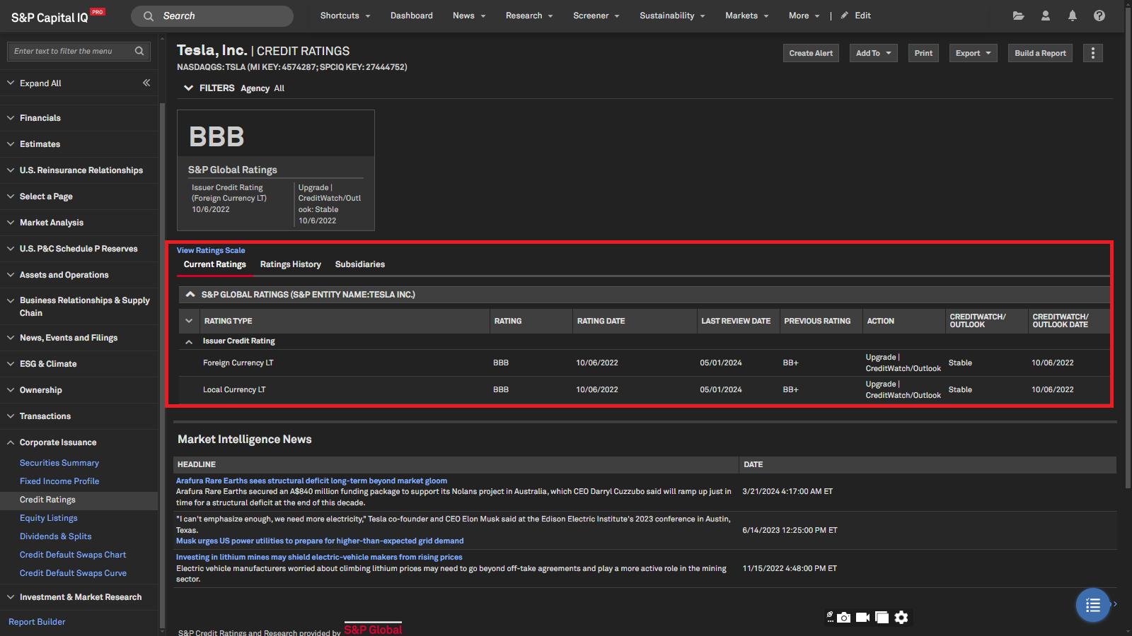 Visit the Capital IQ Pro >> Search Bar >> Company >>Type the Company Name >> Click on Corporate Insurance >> Choose Credit Ratings>> View the results