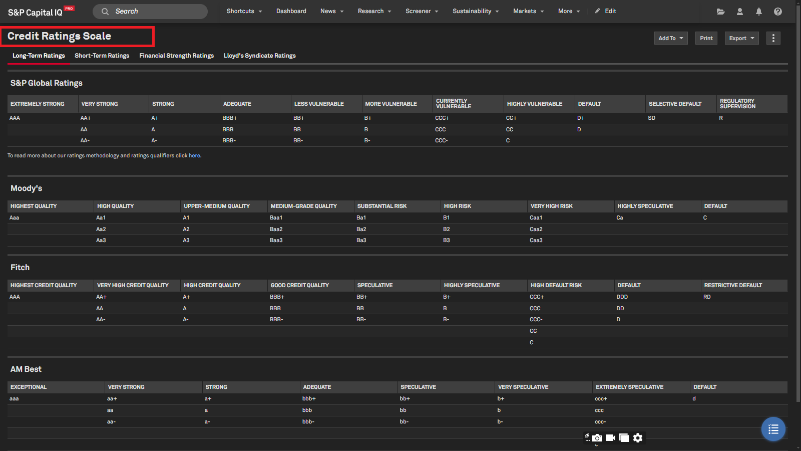Credit ratings are essential in the banking and financial services sector, offering an objective evaluation of the creditworthiness of companies, financial institutions, governments, and various debt instruments. This subject guide compiles key library resources that provide reliable credit rating information and analysis. It highlights major databases featuring ratings from leading agencies, credit reports, financial statements, issuer and bond analyses, historical rating actions, and broader risk evaluations. The guide also outlines how to navigate these platforms effectively, offering guidance on search strategies, filters, and tools to help users quickly locate rating data and related financial insights.