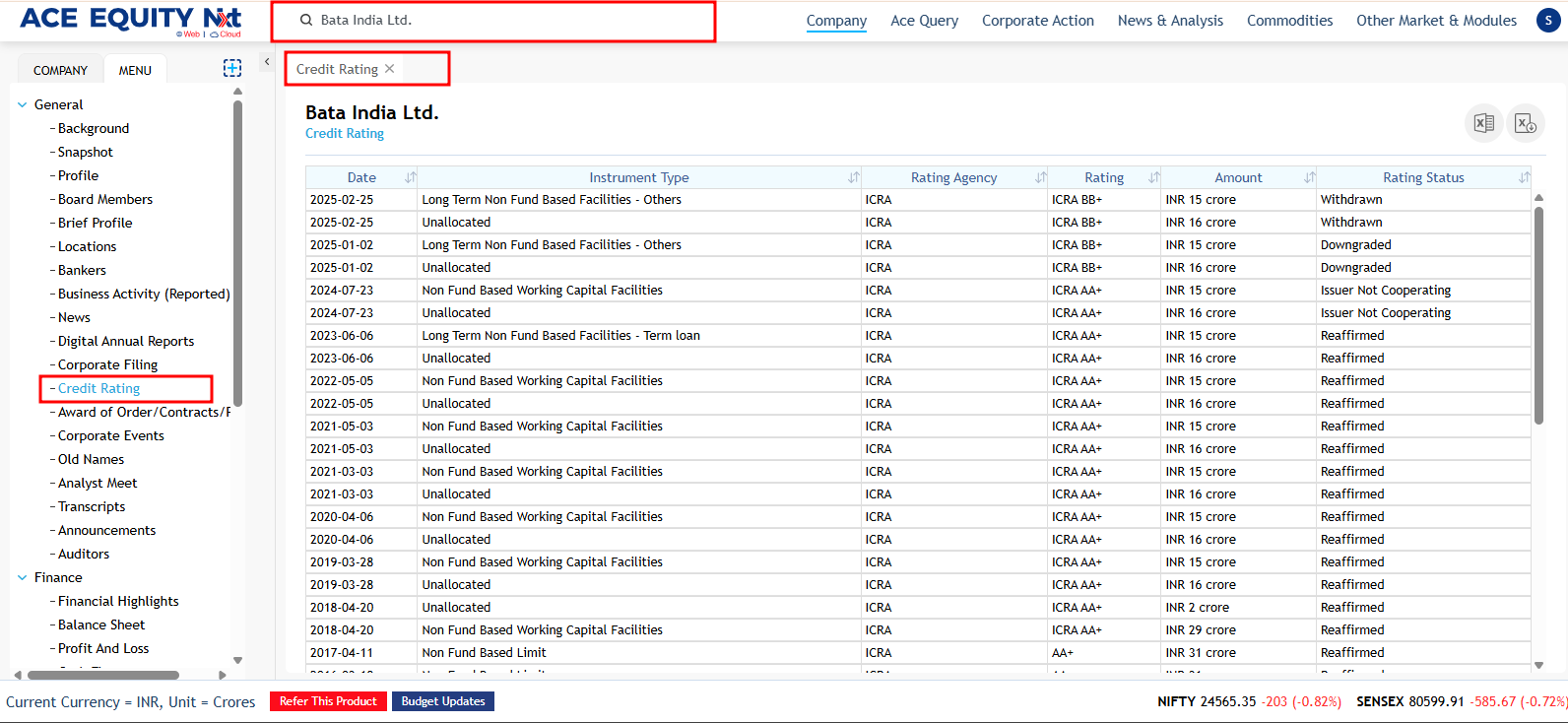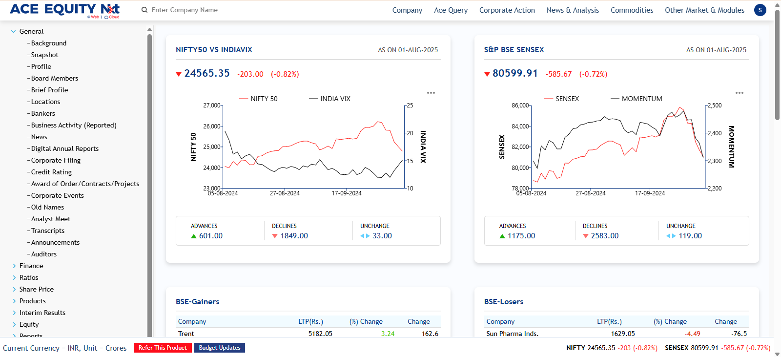 ACE EQUITY Nxt..is a Windows based application where the product data is hosted in cloud. Product provides comprehensive financial data of listed and private companies. The company financial information is available for more than 40,000 Indian companies, including 7,000 listed and 33,000 private with 1750 unique financial data fields compiled from the Annual Report. It also provides company’s non-financial information such as board of directors, share holding pattern, Corporate actions etc. The application is designed in such a manner that with minimal clicks user can achieve the desired output
