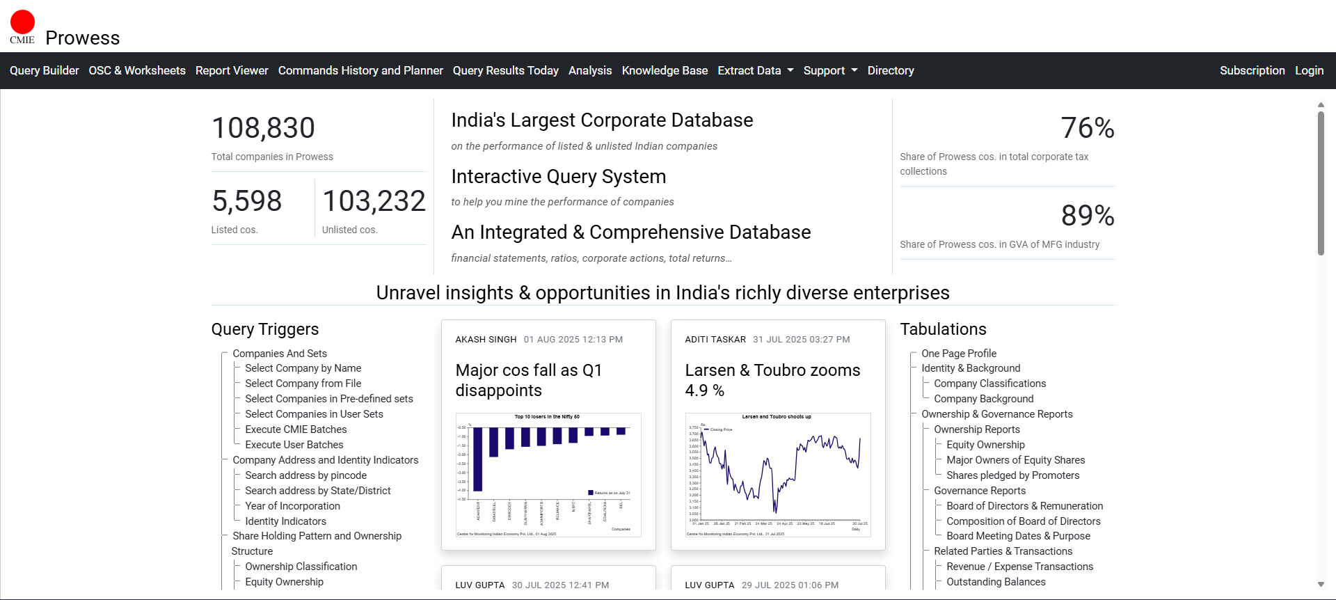 CMIE - Prowess is a comprehensive database and analytics platform providing insights into India's economy, industries, and companies. Prowess enables researchers, analysts, and business professionals to make informed decisions, identify opportunities, and stay ahead in India's dynamic market.