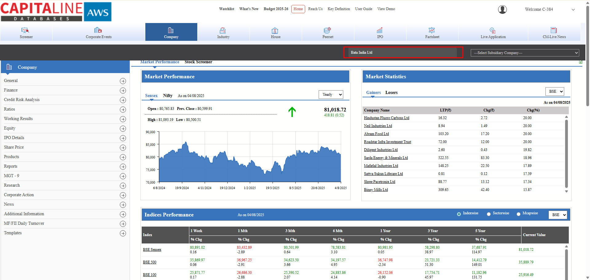 Capitaline database offers robust analytical tools together with fundamental and market data on more than 55000 Indian listed and unlisted companies classified under more than 300 industries, along with powerful analytical tools. In-depth information and analysis on every aspect of a company, including its directors, more than 15 years of financials (P&L, balance sheet, cash flow, consolidated financial data, segment data, forex data, R&D data, and ratios), quarterly results, ownership structure, finished products, raw materials, share price information, directors' report, management discussion, notes to account, business news, corporate events, CSR, etc.