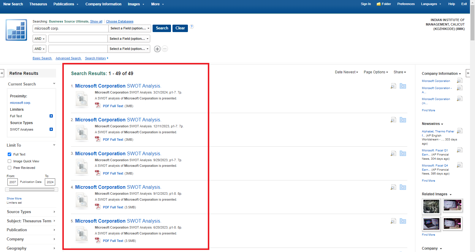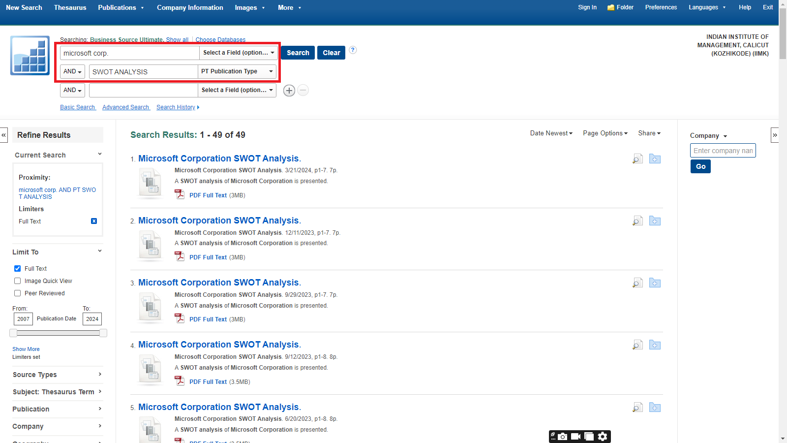 A SWOT analysis, which examines a company’s Strengths, Weaknesses, Opportunities, and Threats, is an essential tool for evaluating an organization’s strategic position. This subject guide compiles key library resources offering detailed SWOT analyses and related company information. It features major databases that provide company profiles, industry reports, financial data, competitive intelligence, and market trend insights. The guide enables users to access reliable information to support informed decision-making and strategic research