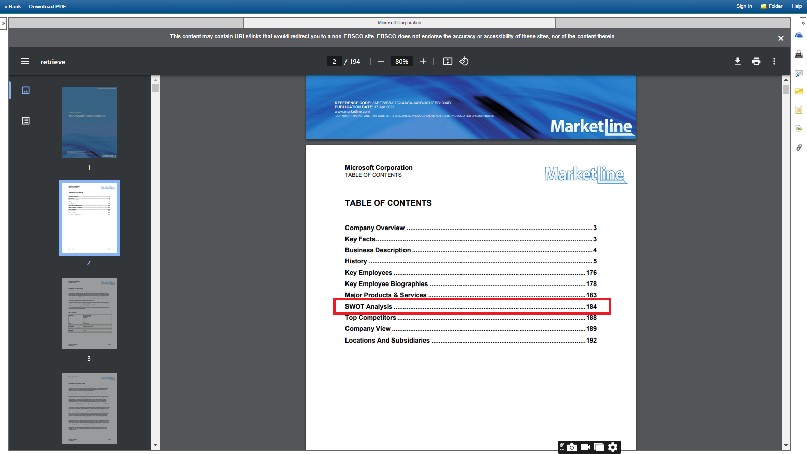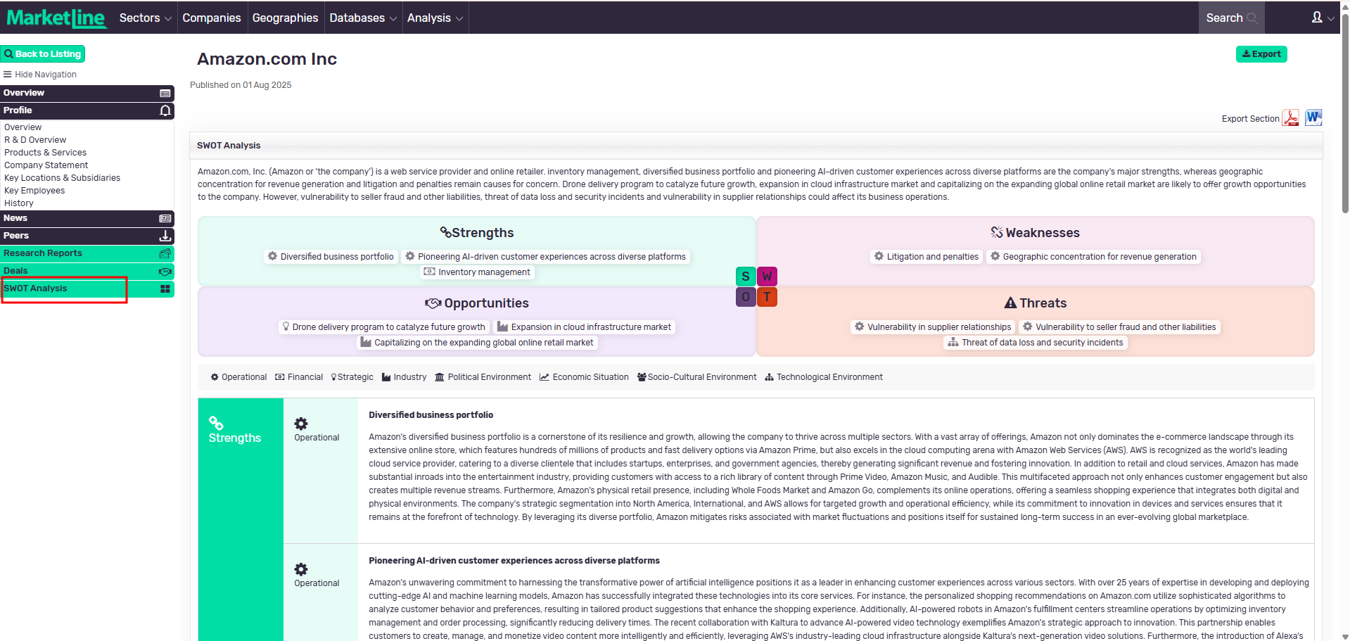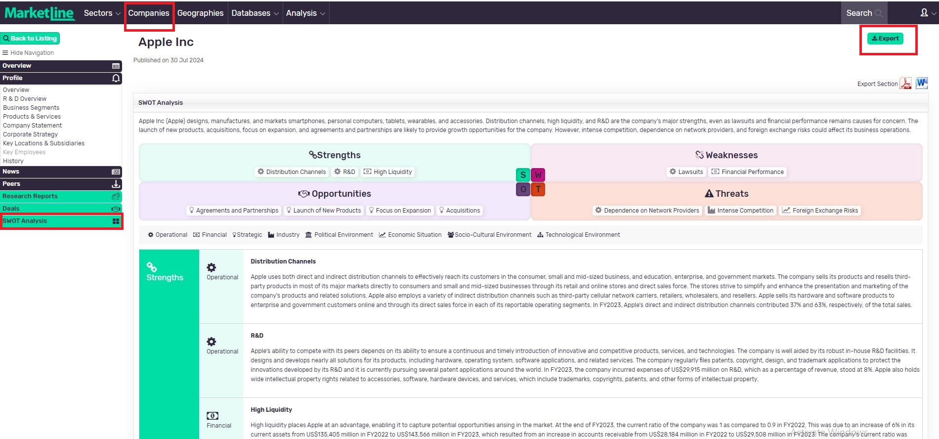 Visit Marketline Advantage >> Click on companies >> Search for a company >> Select SWOT Analysis >> View the results