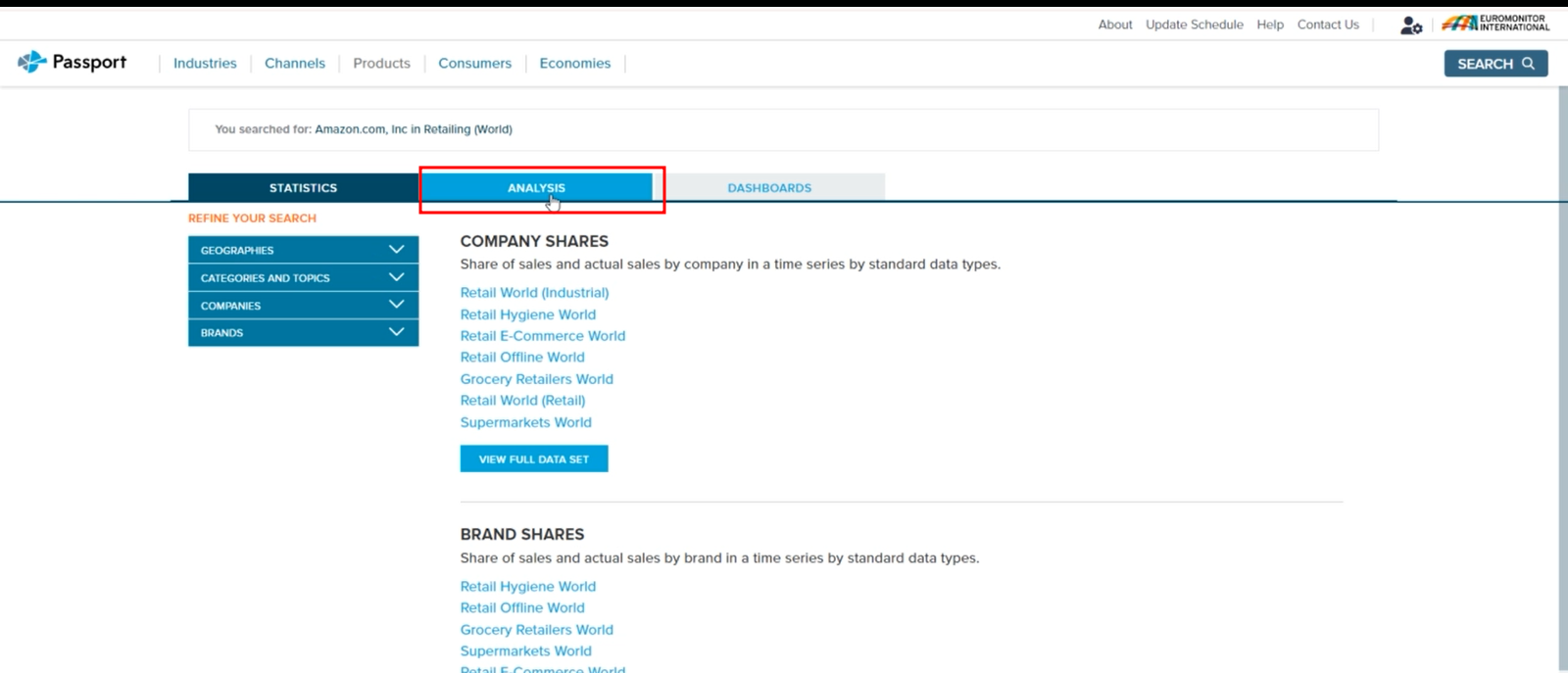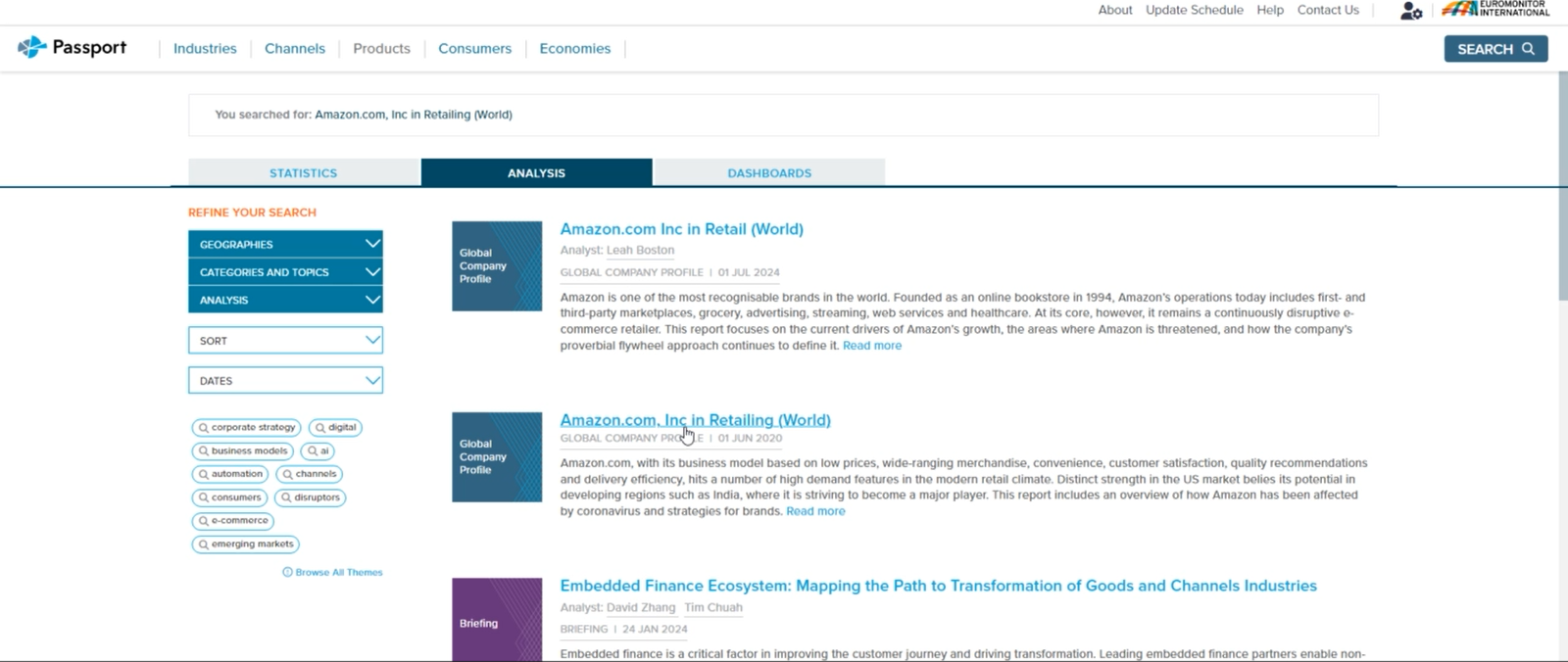 Euromonitor Passport is a global market research database providing insight on industries, economies and consumers worldwide, helping clients analyse market context and identify future trends impacting businesses globally. It offers in-depth information and analysis on industries and consumers for 1200 cities and 210 countries.