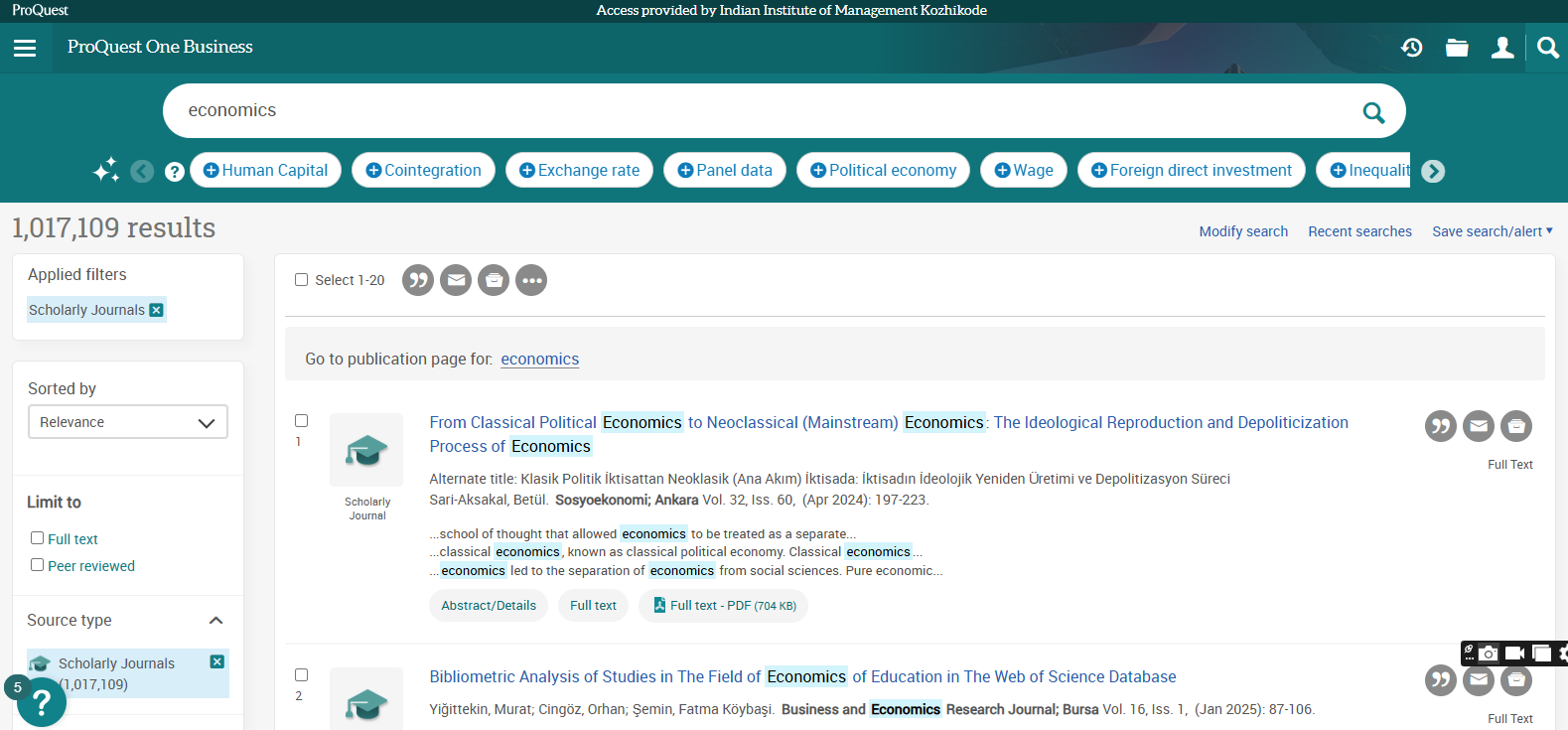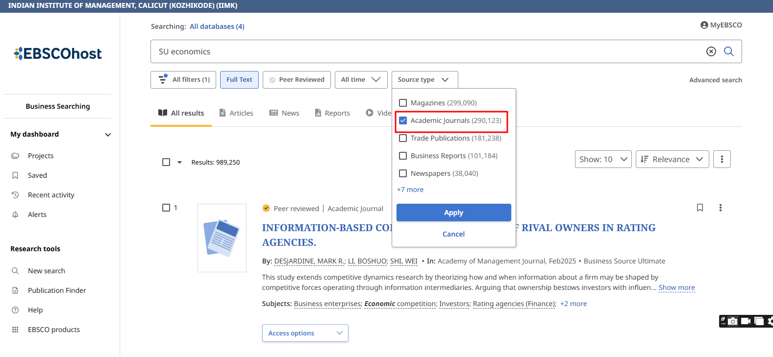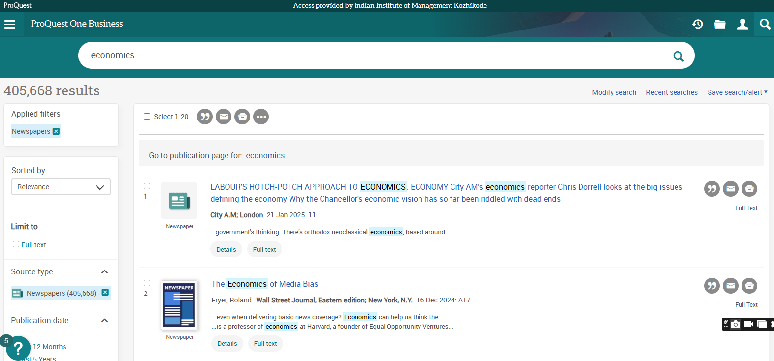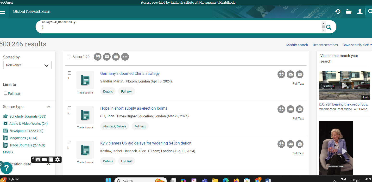 Business Source Ultimate is an aggregated full-text journal database covering almost all Business/ Management subjects like accounting, finance, banking, management information systems, production and operations management, economics, marketing, etc. The collection contains around 8000+ electronic full-text journals and magazines. It also provides profiles of companies and industries.