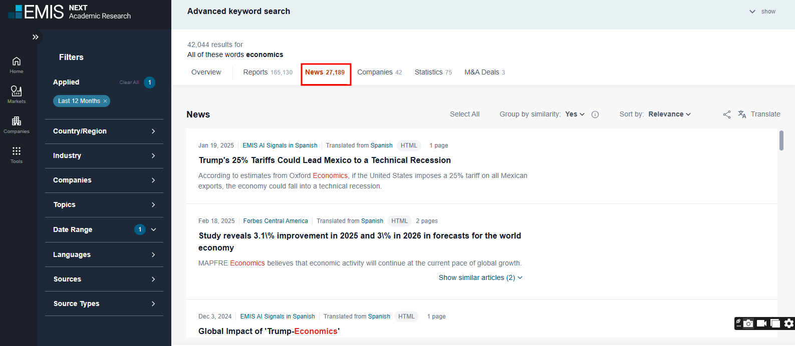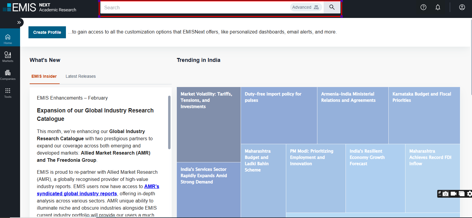 Emerging Markets Information Service (EMIS) Intelligence delivers deep, rich company and industry information alongside the relevant proprietary and multi-source news, research, and analytics that allow professionals to make profitable decisions faster. This single resource of hard-to-get information covers emerging markets, includes company profiles and financials from listed and private companies, offers single company and industry analysis, and delivers proprietary and multi-source news and research publications, all delivered via an easy-to-use interface.