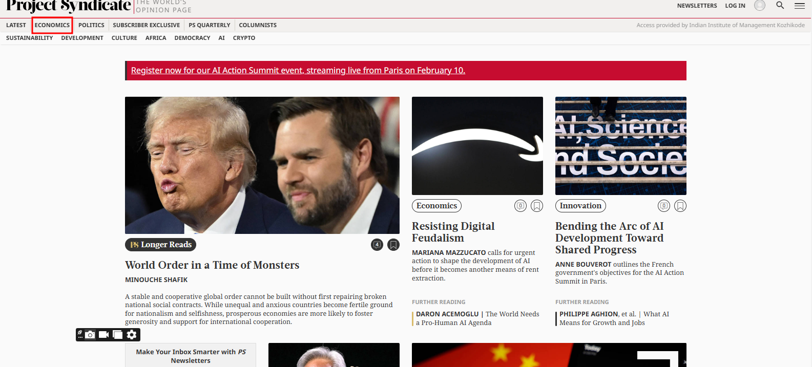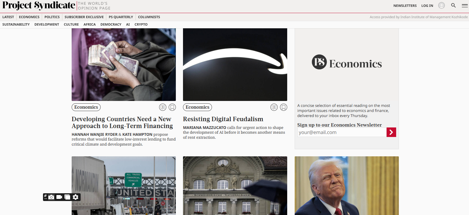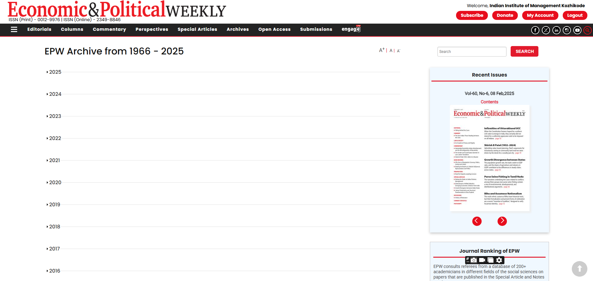 The Economics Area of IIMK carries out rigorous empirical and theoretical research on a wide variety of issues. The research and academic interest of the area includes Agricultural and Indian Economic Policy, Applied Econometrics, Applied Economics, Development Economics, Economics of Information, Economics of Institutions, Economics of Money, Credit and Banking, Energy Economics, Environmental Governance and Management, Financial Markets, International Trade, Labour Economics, Macroeconomics, Public Finance etc.