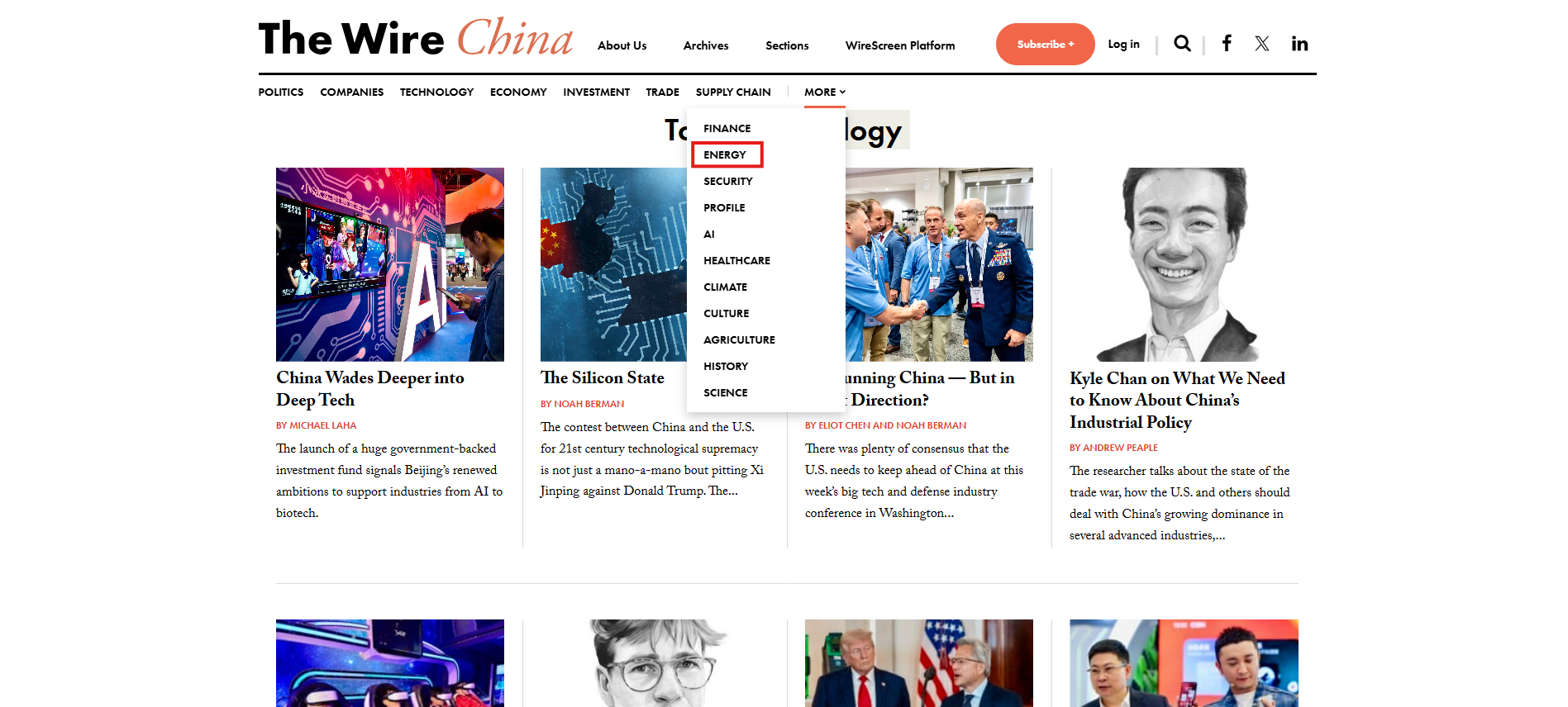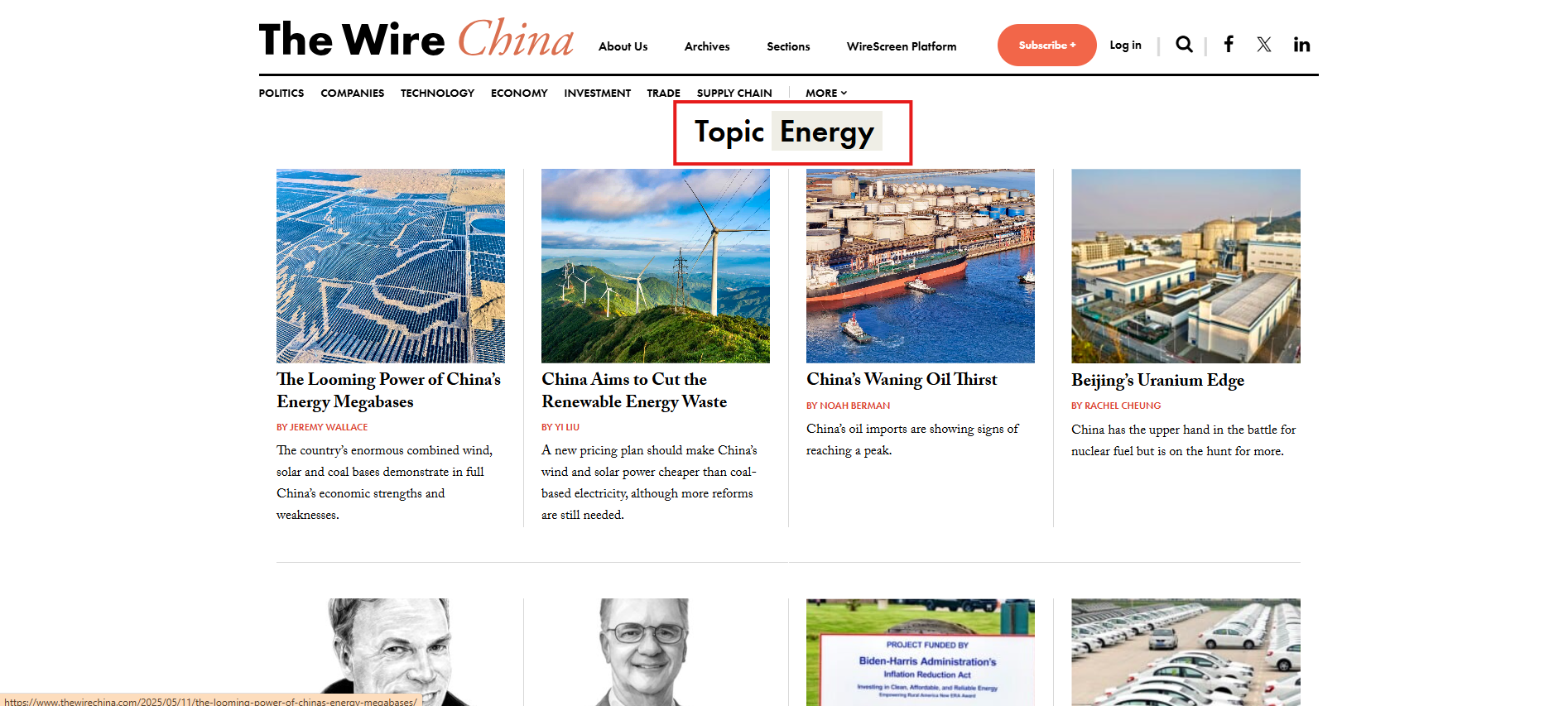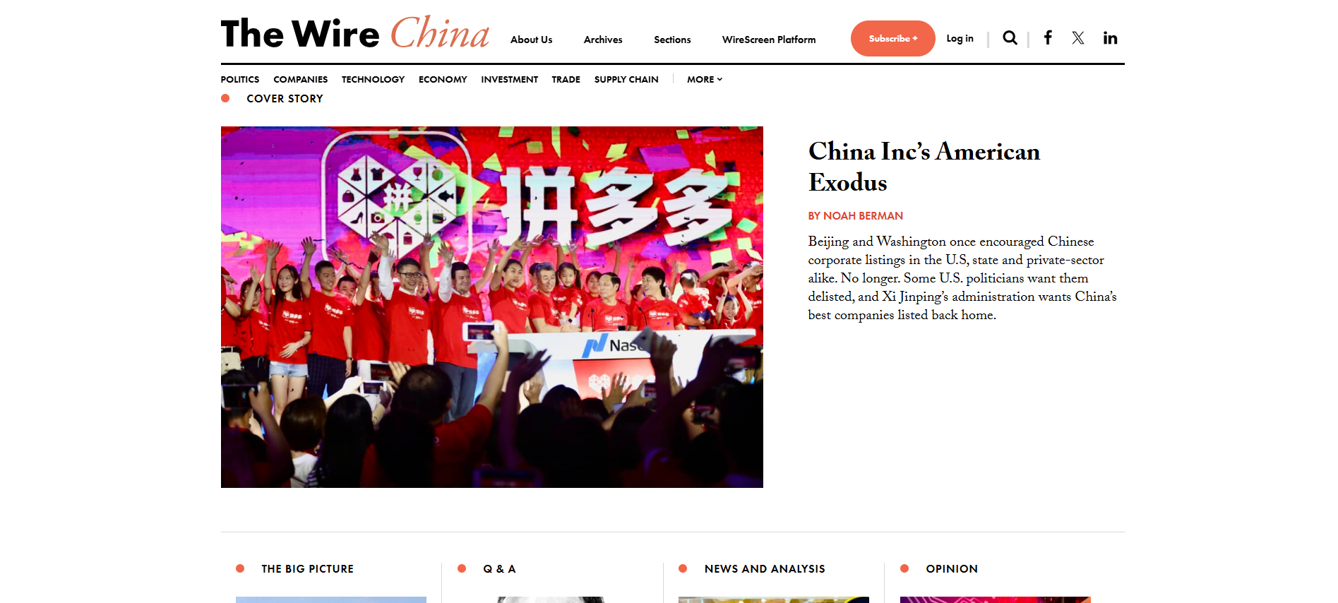 The Wire China is a weekly online news magazine focused on Chinese business, economics and finance. It publishes five to six articles per week including a 3,000-5,000 word cover story, a news and analysis piece, a data investigation called 'The Big Picture', Q&A, and an Opinion section.