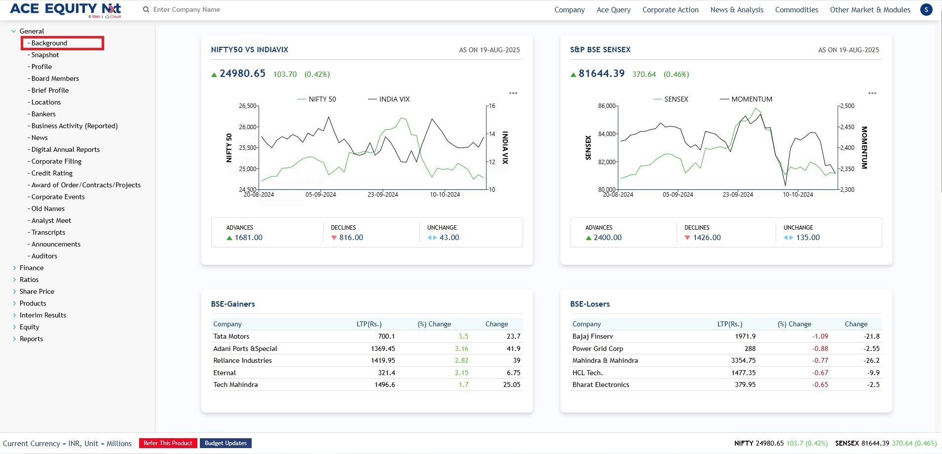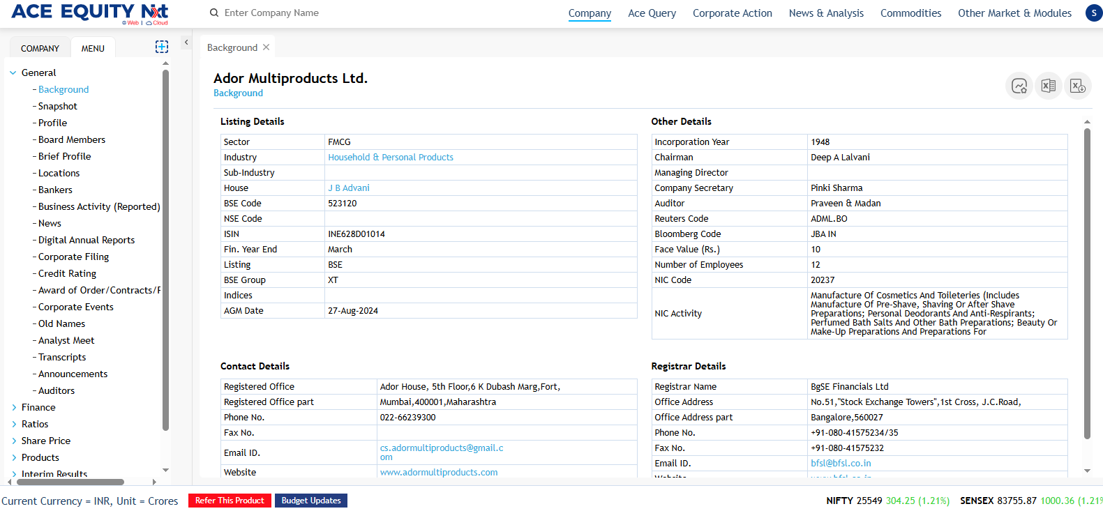 ACE EQUITY Nxt..is a Windows based application where the product data is hosted in cloud. Product provides comprehensive financial data of listed and private companies. The company financial information is available for more than 40,000 Indian companies, including 7,000 listed and 33,000 private with 1750 unique financial data fields compiled from the Annual Report. It also provides company’s non-financial information such as board of directors, share holding pattern, Corporate actions etc. The application is designed in such a manner that with minimal clicks user can achieve the desired output