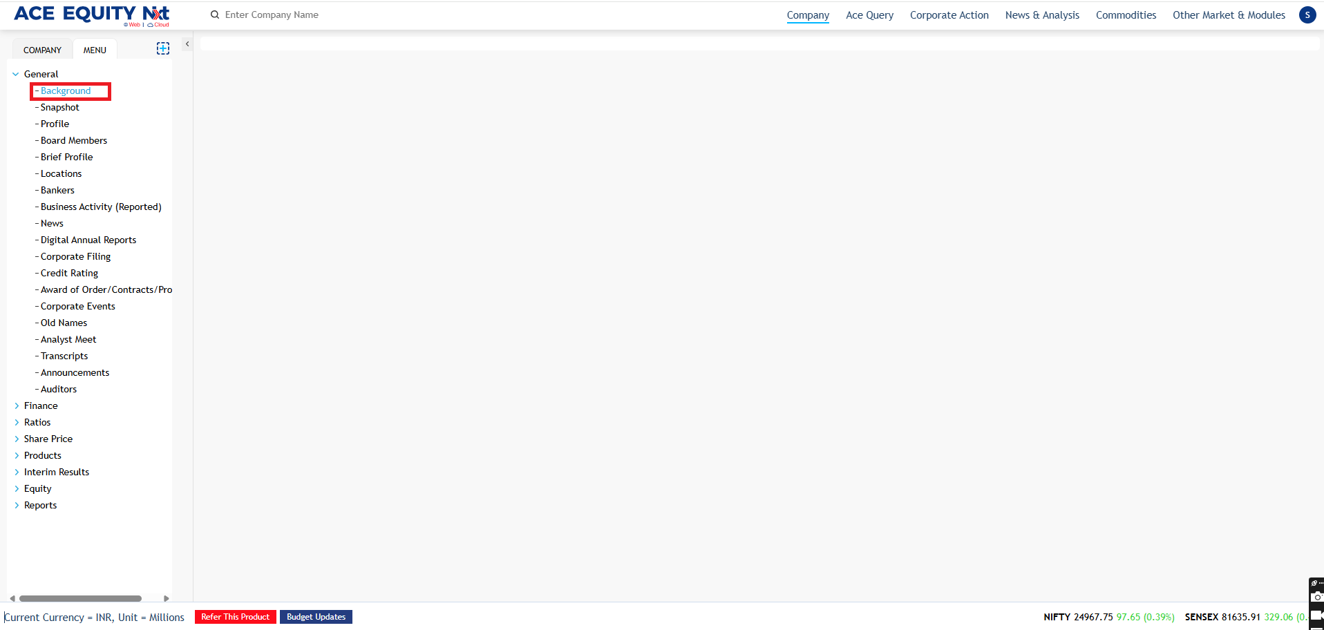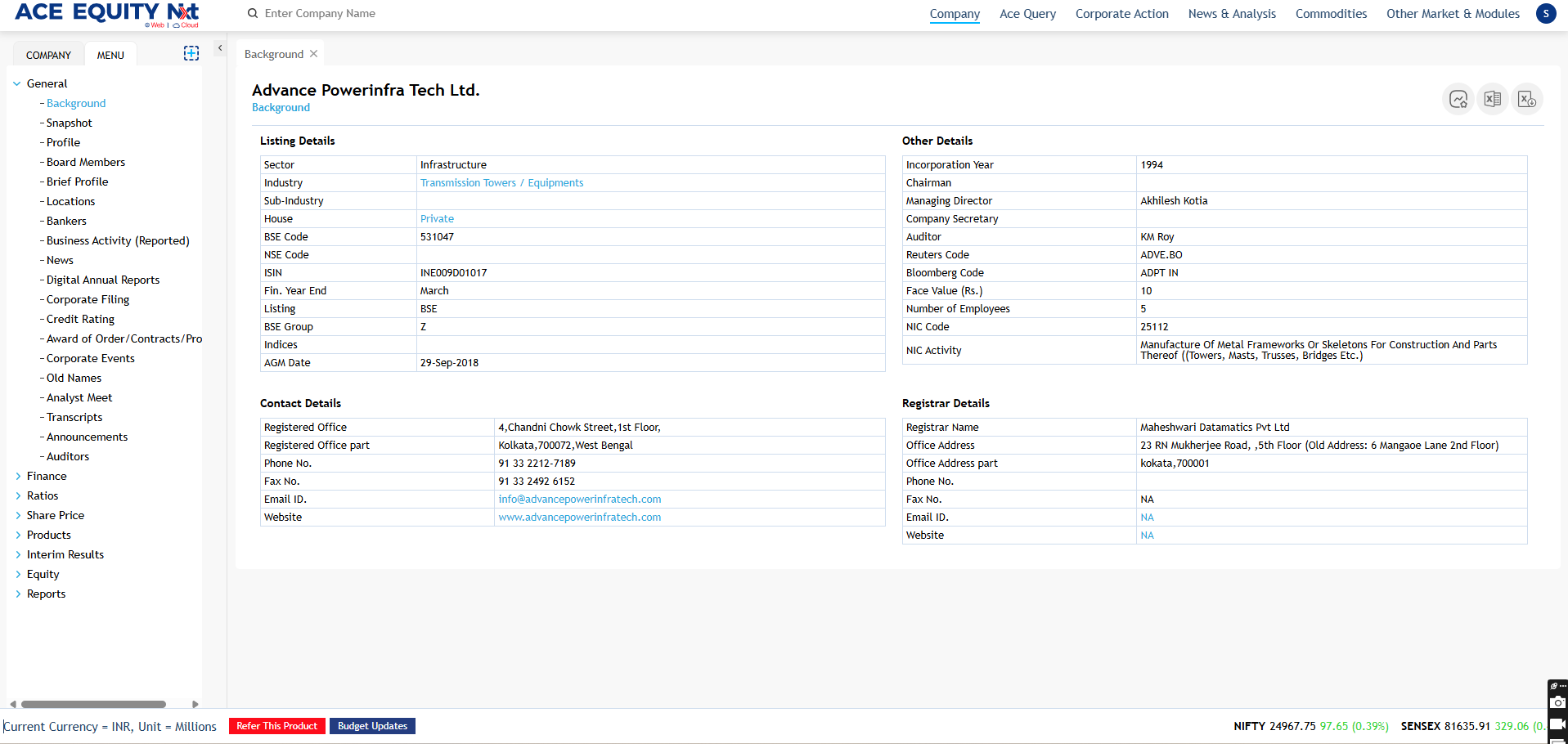 ACE EQUITY Nxt..is a Windows based application where the product data is hosted in cloud. Product provides comprehensive financial data of listed and private companies. The company financial information is available for more than 40,000 Indian companies, including 7,000 listed and 33,000 private with 1750 unique financial data fields compiled from the Annual Report. It also provides company’s non-financial information such as board of directors, share holding pattern, Corporate actions etc. The application is designed in such a manner that with minimal clicks user can achieve the desired output