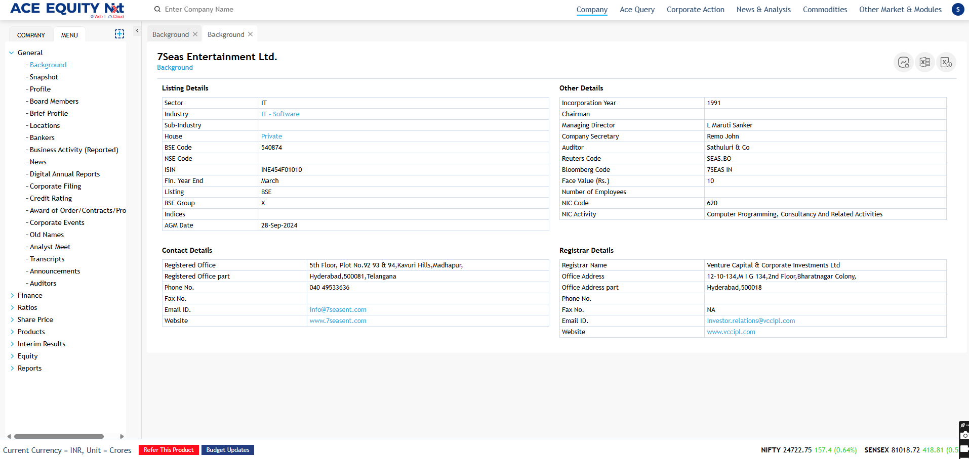 ACE EQUITY Nxt..is a Windows based application where the product data is hosted in cloud. Product provides comprehensive financial data of listed and private companies. The company financial information is available for more than 40,000 Indian companies, including 7,000 listed and 33,000 private with 1750 unique financial data fields compiled from the Annual Report. It also provides company’s non-financial information such as board of directors, share holding pattern, Corporate actions etc. The application is designed in such a manner that with minimal clicks user can achieve the desired output