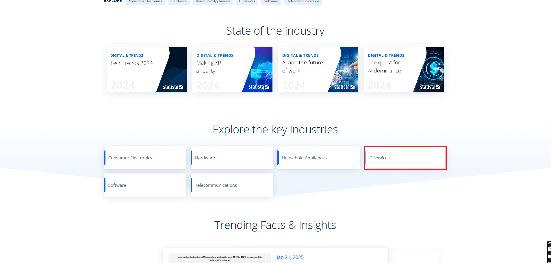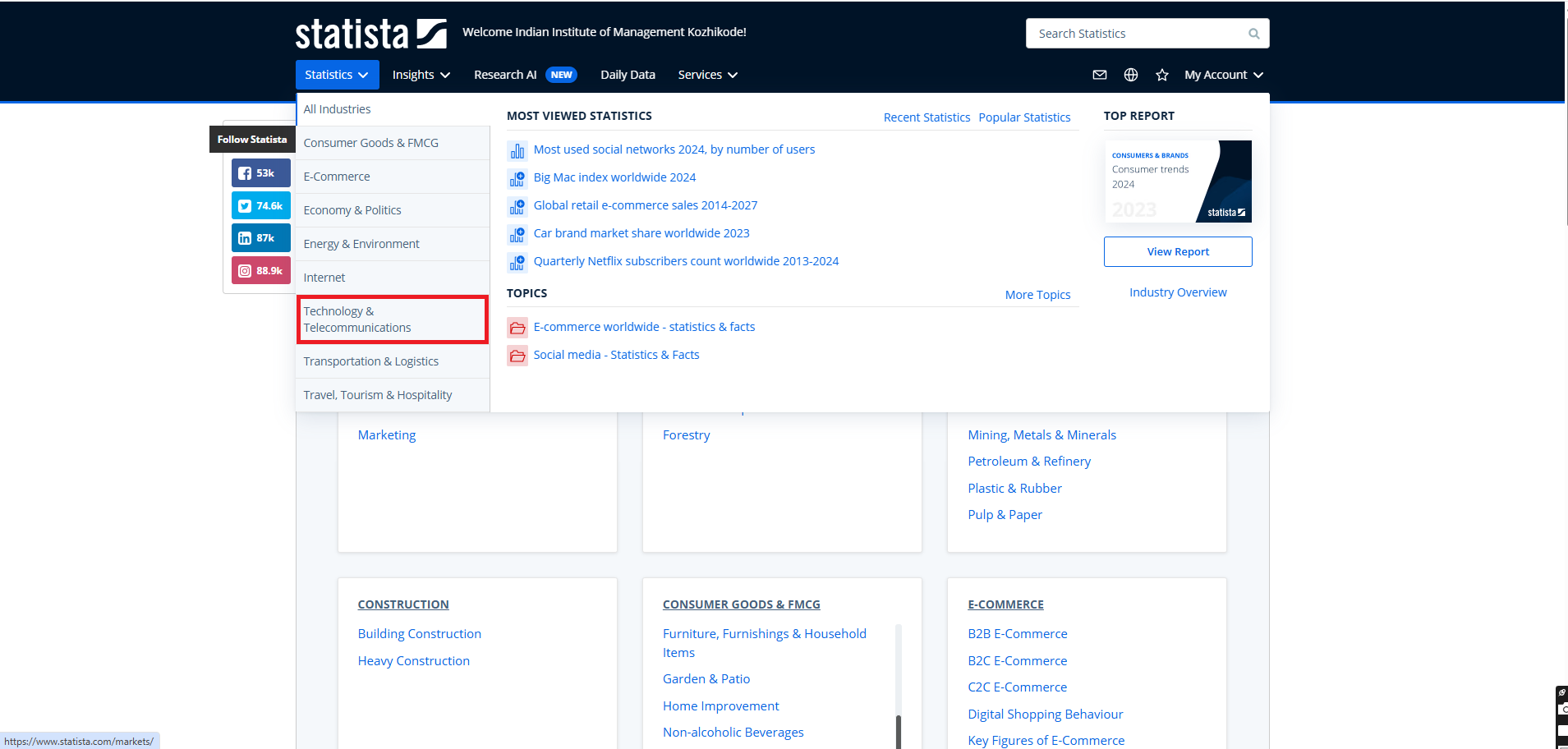 Statista is a global data and business intelligence platform with an extensive collection of statistics, reports, and insights on over 80,000 topics from 22,500 sources in 170 industries. Statista allows users to quickly and efficiently access relevant information on a wide variety of topics: Industry-specific economic macro data with key indicators of market trends, Industry-specific surveys on relevant trends and forecasts Consumer behavior studies. Statista.com provides companies, business customers, research institutions, and the academic community with direct access to quantitative data on media, business, finance, politics, and a wide variety of other areas of interest or markets.