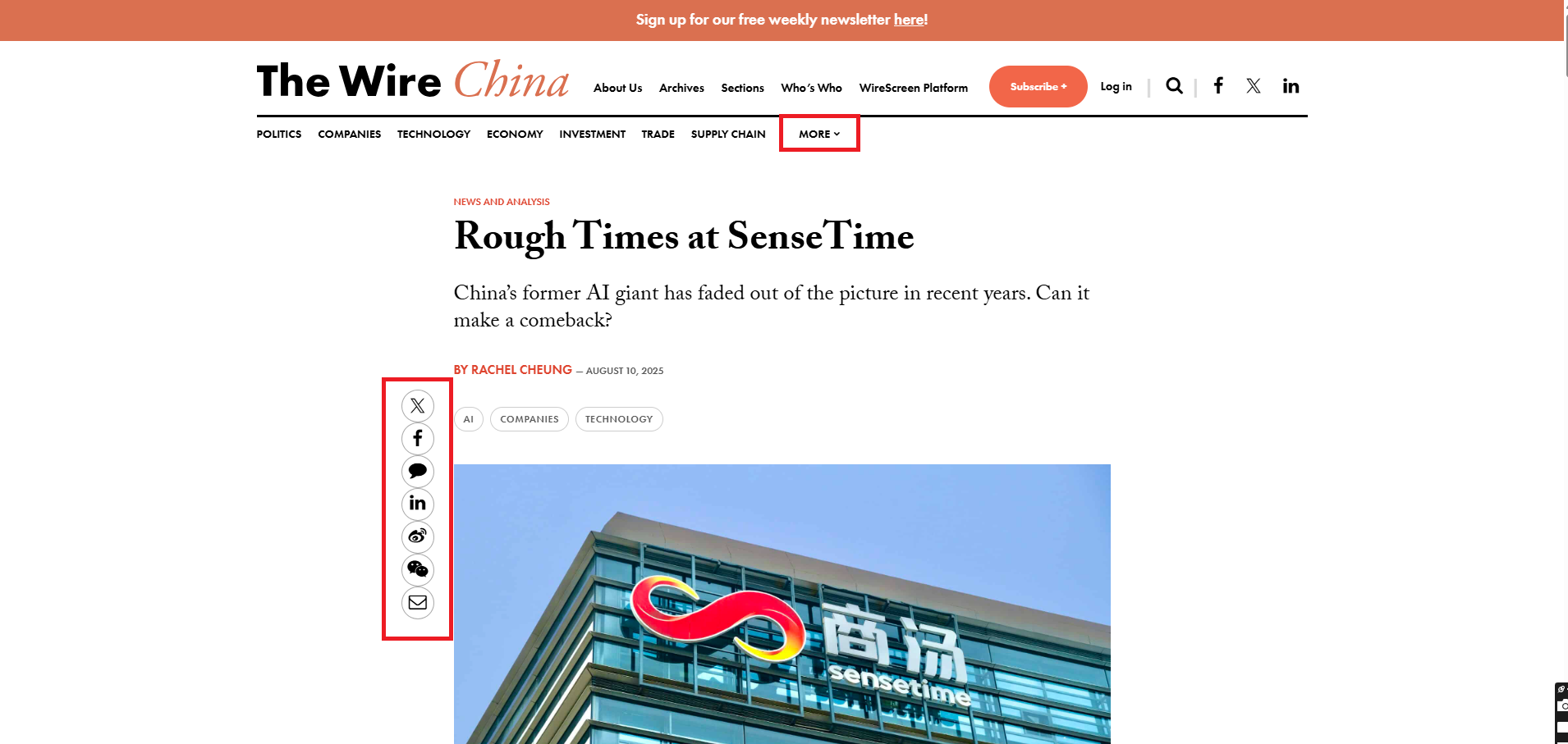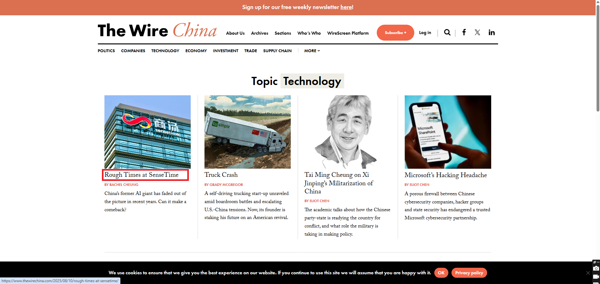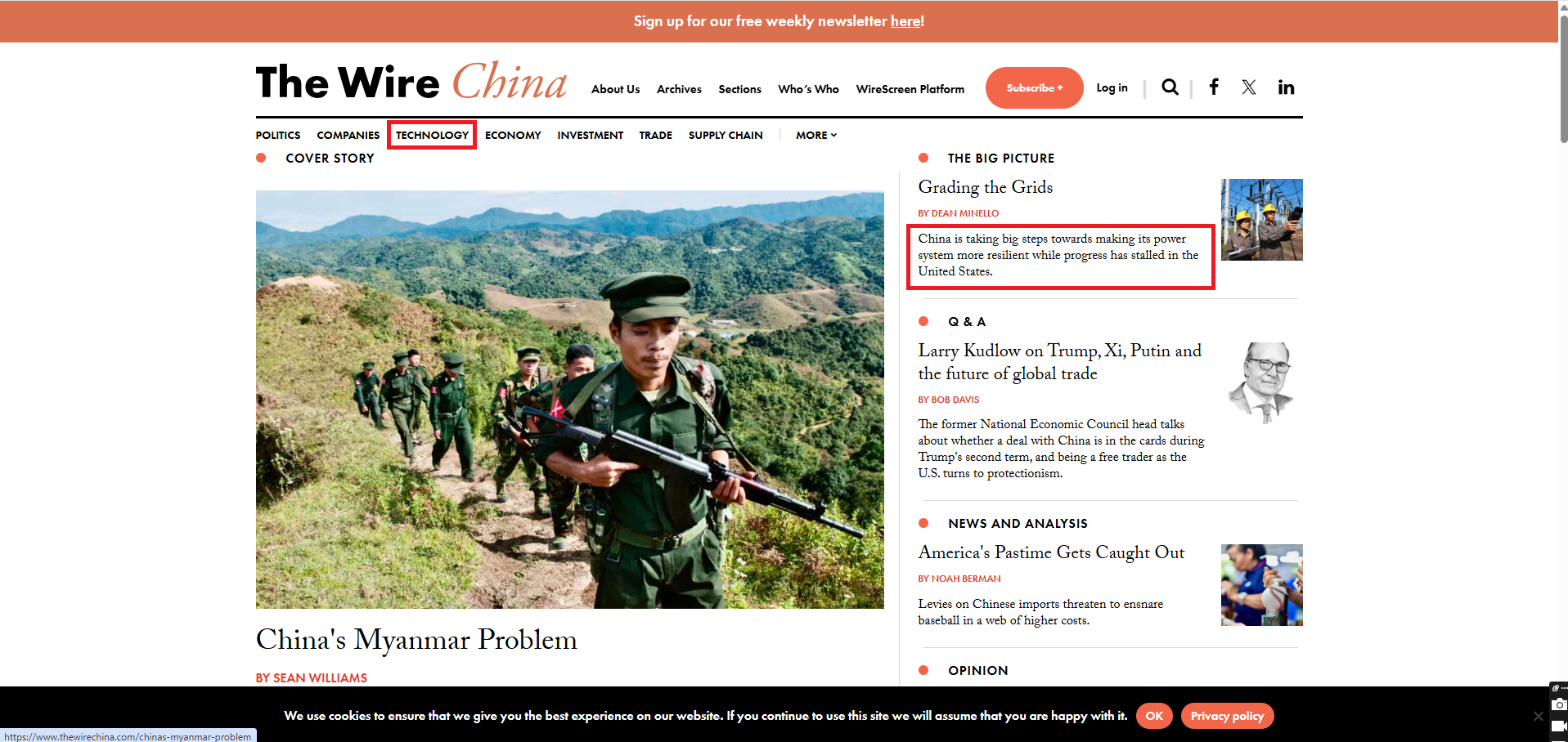The Wire China is a weekly online news magazine focused on Chinese business, economics and finance. It publishes five to six articles per week including a 3,000-5,000 word cover story, a news and analysis piece, a data investigation called 'The Big Picture', Q&A, and an Opinion section.
