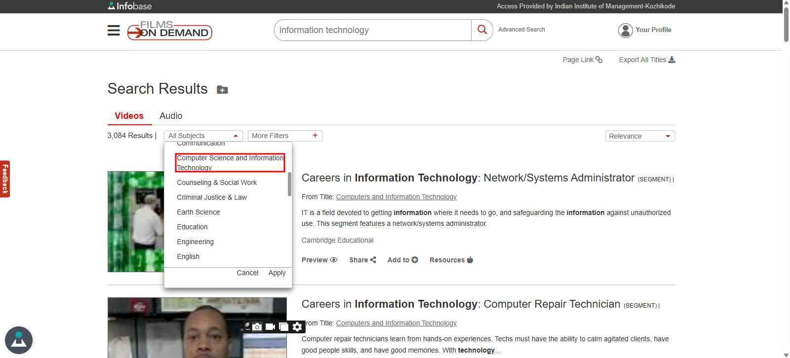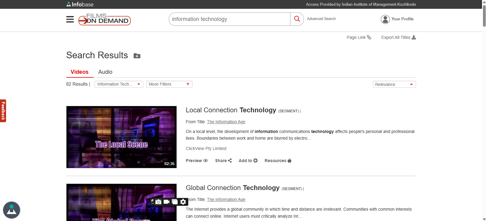 Unrestricted access to thousands of videos on a wide range of curricular topics, such as history, biology, business and economics, engineering, computer science, technical and trade skills, art, and architecture, is offered via a comprehensive curriculum-focused video collection.