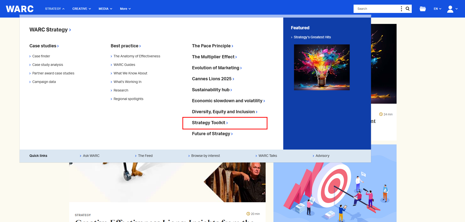 WARC (World Advertising Research Center) is an online platform that provides access to a wide range of marketing and advertising research, data, and insights. It is a subscription-based service that offers a vast collection of case studies, best practices, research papers, and industry reports. WARC is used by marketers, advertisers, and agencies around the world to stay up-to-date with the latest trends and developments in the industry and to find insights and inspiration for their marketing campaigns.