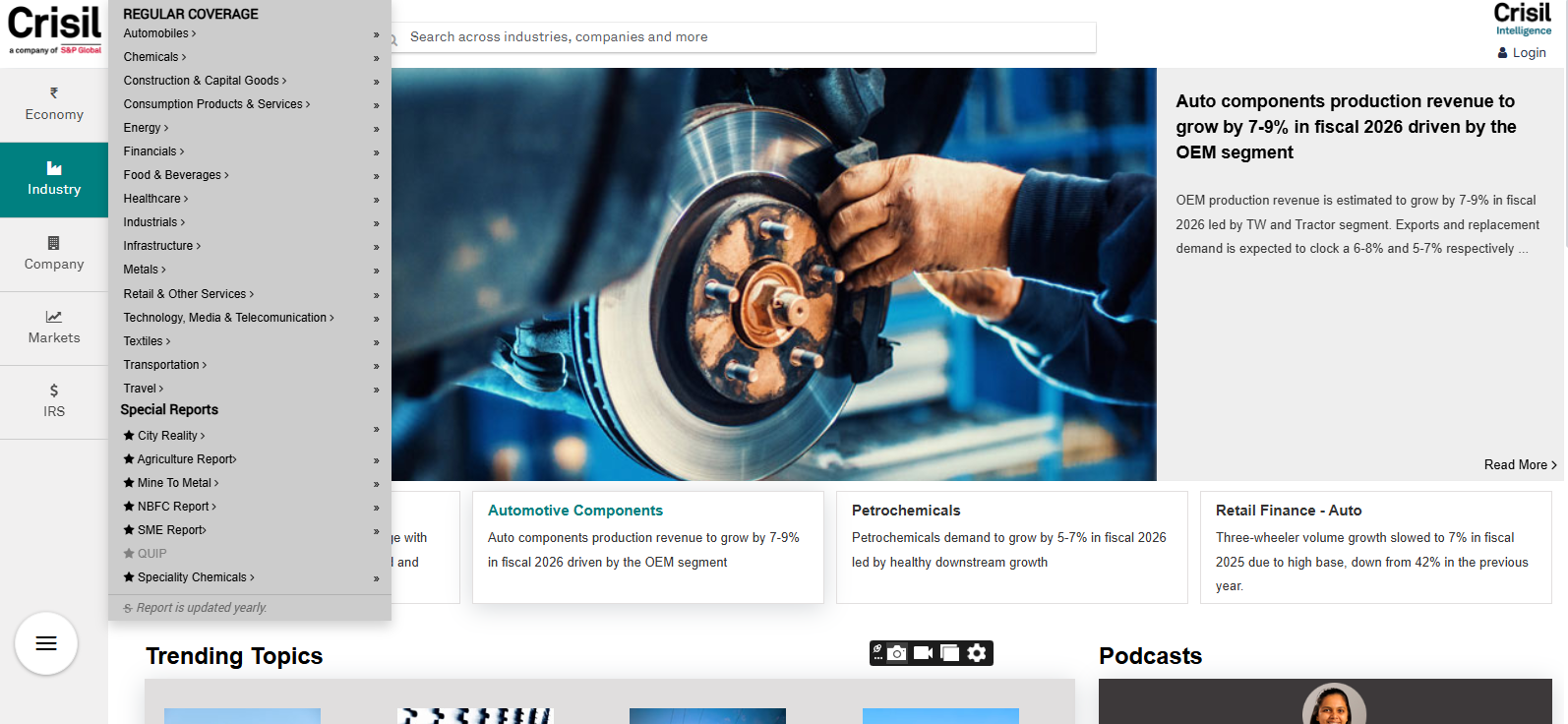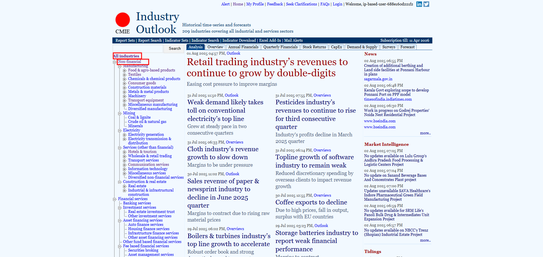 Industry Outlook provides a well-balanced presentation of data, analysis, and forecasts on 209 industries. The service draws upon data available from government sources, industry and trade associations, commodity markets, firm-level databases, and project-level information. It weaves these disparate sources into meaningful and well-organized presentations of the current and prospective trends in Indian industries. Expected creation of new capacities, projected financial performance, market share, price movements of commodities, demand-supply balances or gaps in the future - these are some of the indicators that Industry Outlook provides information on. Industry Outlook is particularly useful in understanding the current and expected trends in the economic environment in which your industry operates. These are your suppliers' industries, your customers' industries, or your competing industries. These are the industries that credit officers lend to. These are the industries that fund managers invest in. For business schools, these are the industries that the students will get into. Industry Outlook is indispensable because it is comprehensive. The service draws upon data available from government sources, industry and trade associations, commodity markets, firm-level databases, and project-level information. It weaves these disparate sources into meaningful and well-organized presentations of the current and prospective trends in Indian industries
