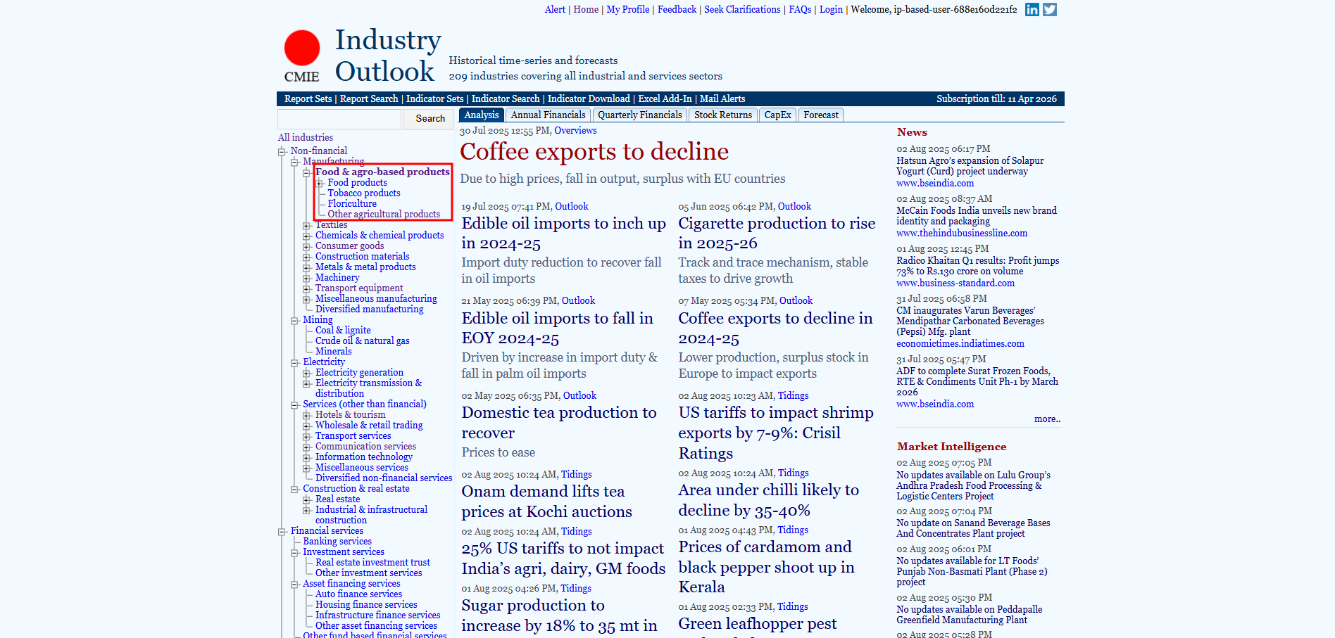 Visit CMIE Industry outlook >> All industry >> Click on Non- financial >> Click on Manufacturing >>Click on food and agro- base products >> food products >> View the results