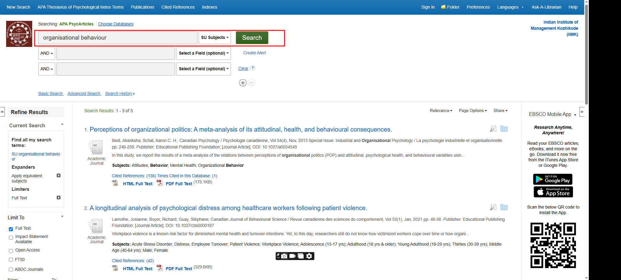 A definitive source of full-text, peer-reviewed scholarly and scientific articles in psychology. It contains more than 200000 articles from nearly 120 journals published by the American Psychological Association (APA), its imprint the Educational Publishing Foundation (EPF), and from allied organizations including the Canadian Psychological Association and the Hogrefe Publishing Group. It includes all journal articles, book reviews, letters to the editor, and errata from each journal. Coverage spans 1894 to present; nearly all APA journals go back to Volume 1, Issue 1.