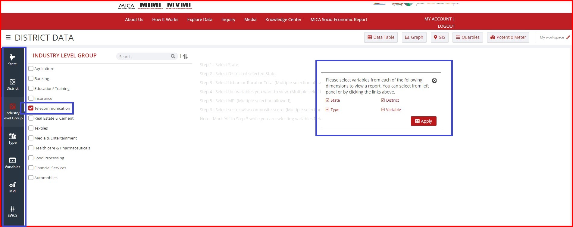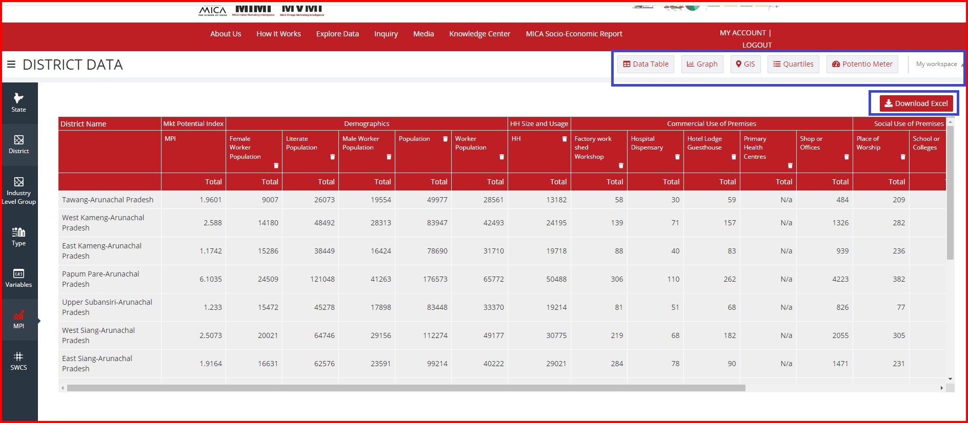 MVMI:- MICA Village Marketing Intelligence (MVMI) is first in its type, and it provides the secondary data for socio-economic variables and market intelligence up to the Village level for all the States and Union Territories of India. The summary of such information is provided up to District level and Sub-District level. In addition to that Rural MPI (Market Potential Index) for 630 Districts is also provided.