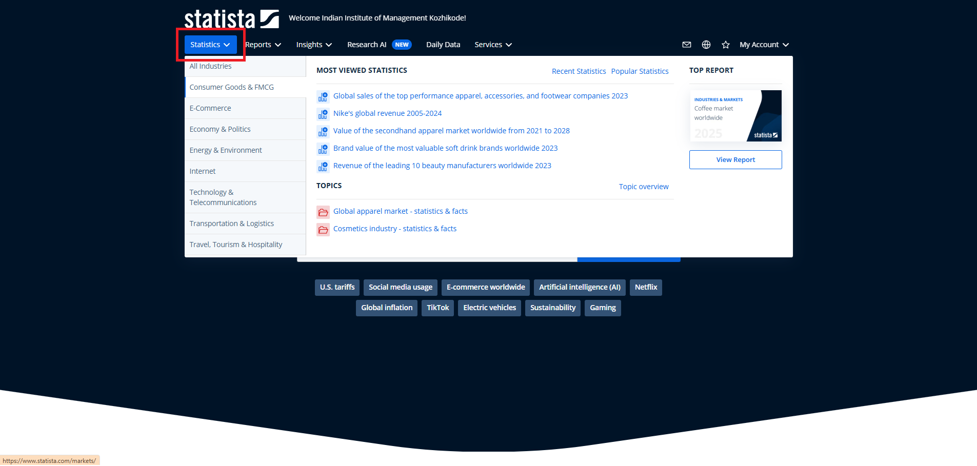 Statista is a global data and business intelligence platform with an extensive collection of statistics, reports, and insights on over 80,000 topics from 22,500 sources in 170 industries. Statista allows users to quickly and efficiently access relevant information on a wide variety of topics: Industry-specific economic macro data with key indicators of market trends, Industry-specific surveys on relevant trends and forecasts Consumer behavior studies. Statista.com provides companies, business customers, research institutions, and the academic community with direct access to quantitative data on media, business, finance, politics, and a wide variety of other areas of interest or markets.
